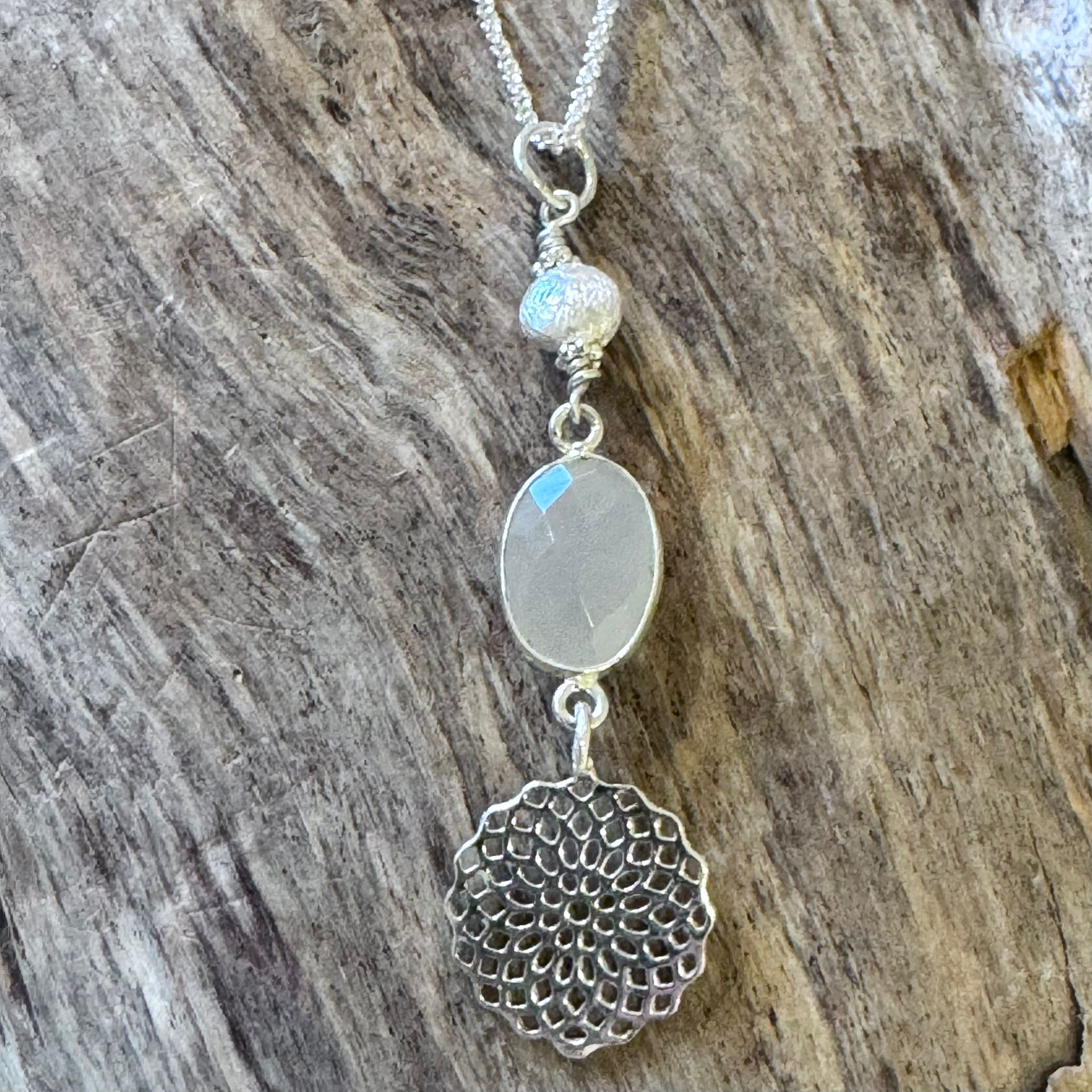 Diesen schönen Anhänger haben wir aus einem münzförmigem Element aus mattiertem Sterlingsilber (4mm), einem facettiertem hellgrauem Mondstein (15x10mm) und einem Mandala-Element aus mattiertem Sterlingsilber (15mm) kreiert. Der Anhänger hat eine Länge von 5,5cm.