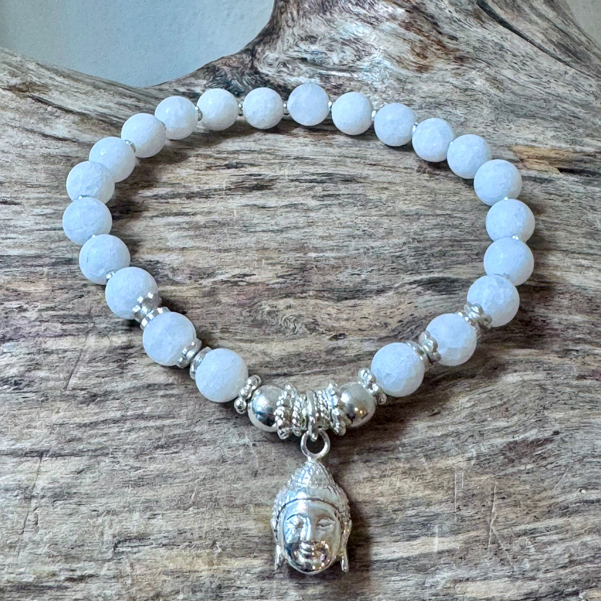 Dieses schöne elastische Armband haben wir aus mattiertem Serpentin (6mm), sehr vielen Zwischenstücken aus Sterlingsilber und einem Buddha-Charm aus Sterlingsilber (15x10mm) kreiert. Das Armband hat eine Länge von 18cm.