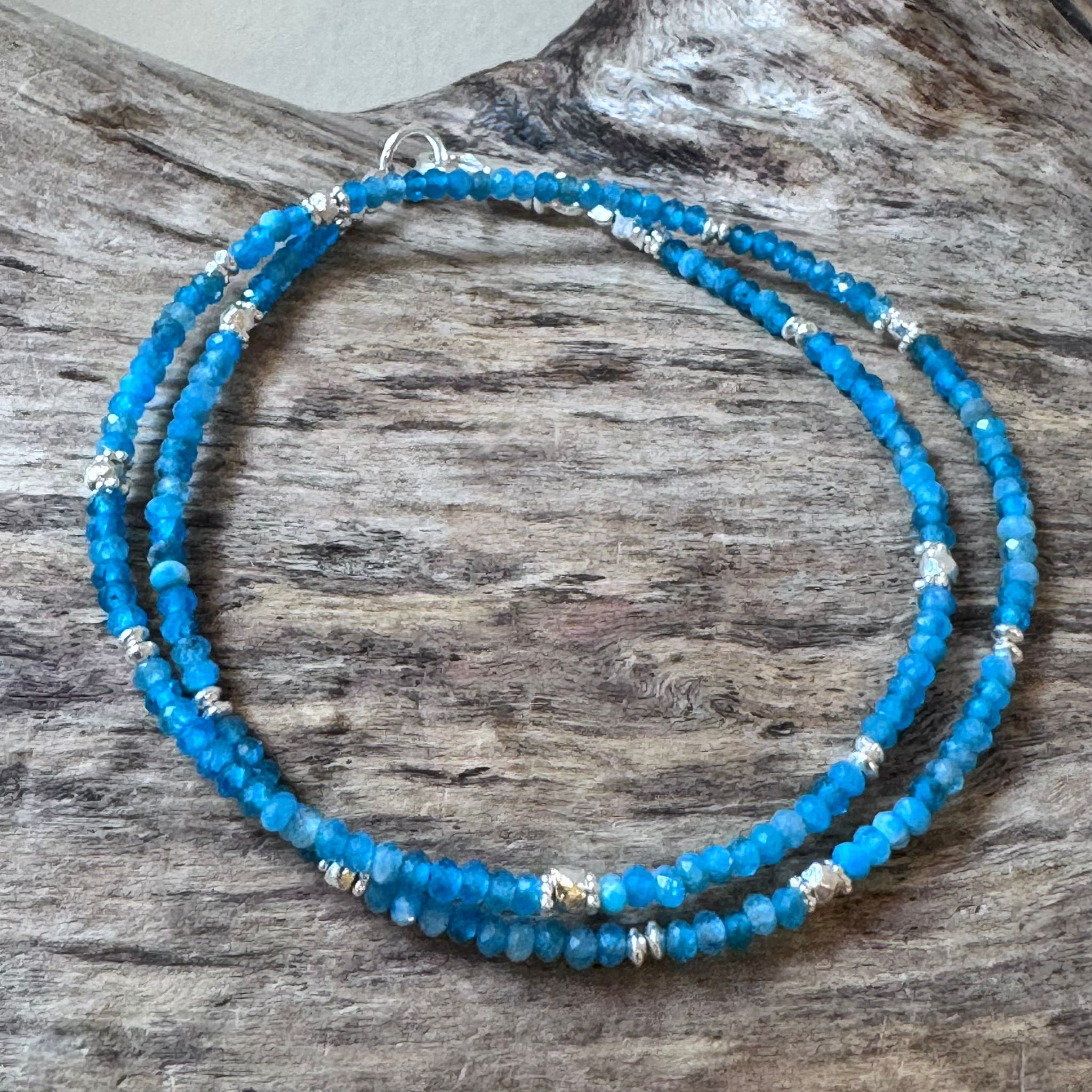 Dieses schöne Armband haben wir aus facettiertem Apatit (1,5x2mm) und Zwischenstücken aus Sterlingsilber kreiert. Das Armand hat eine Länge von 35,5cm und wird zweimal um das Handgelenk gewickelt.