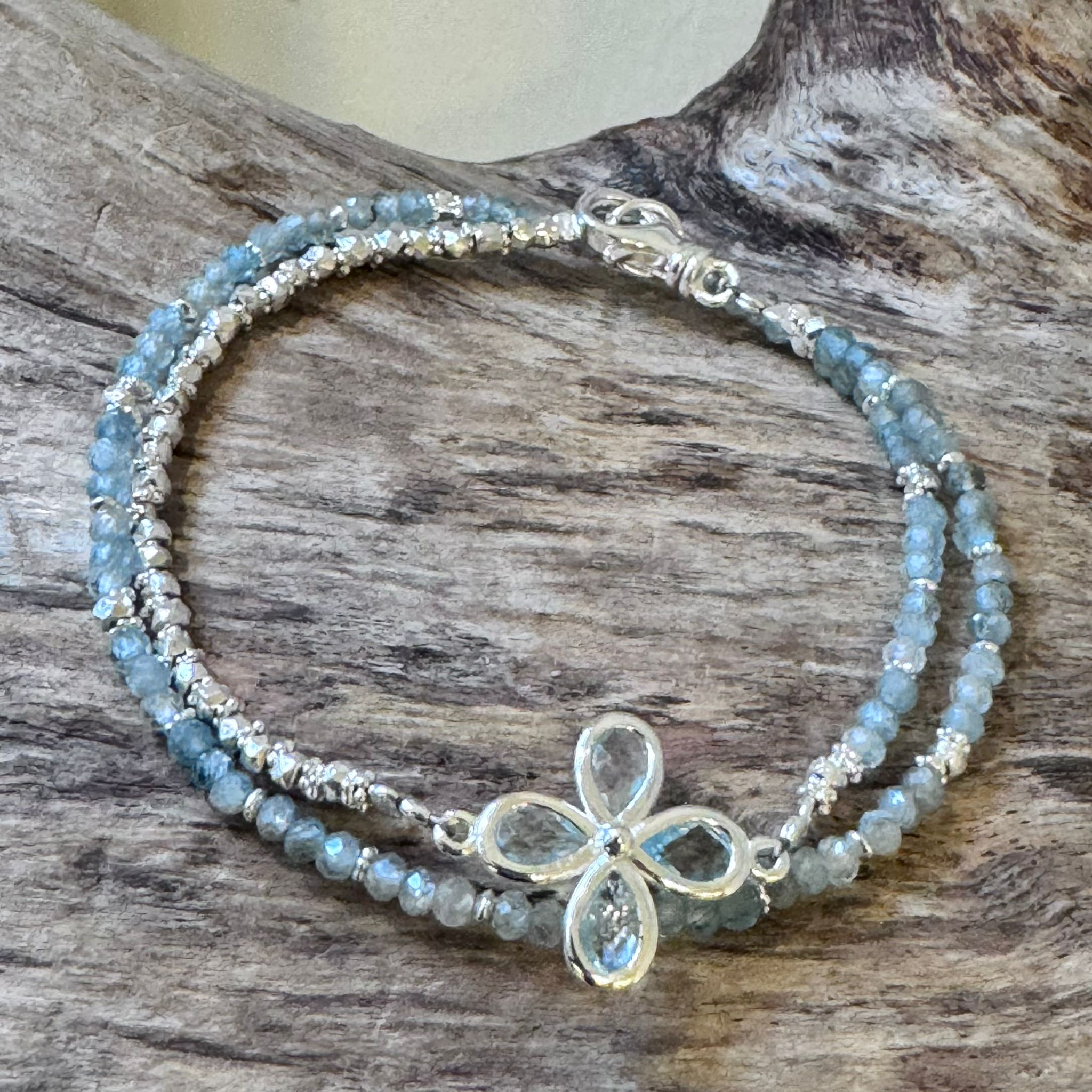 Dieses schöne Armband haben wir aus facettiertem blauem Zirkon (2x3mm), vielen Zwischenstücken aus Sterlingsilber und einem Verbindungselement aus facettiertem blauem Topas (16mm) kreiert. Das Armband hat eine Länge von 35cm und wird zweimal um das Handgelenk gewickelt.