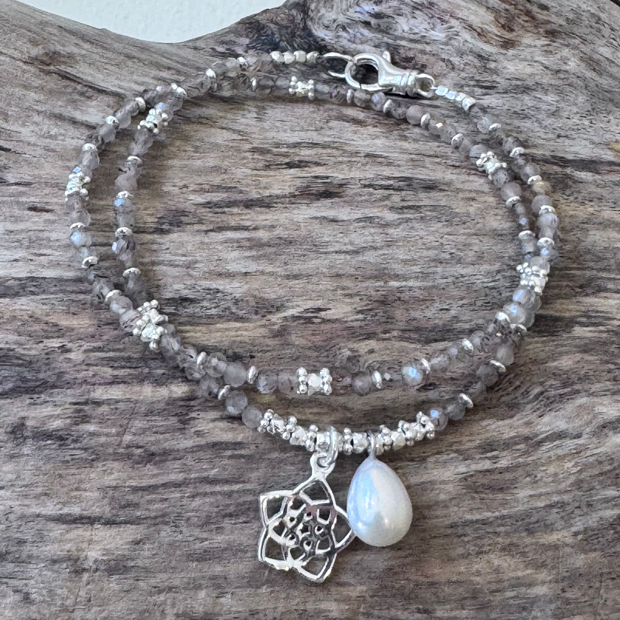 Dieses schöne Armband haben wir aus facettiertem braunem Mondstein (2mm), sehr vielen Zwischenstücken aus Sterlingsilber, einem Charm aus einer tropfenförmigen Süsswasserperle (10x6mm) und einem Charm aus Sterlingsilber (11mm) kreiert. Das Armband hat eine Länge von 35cm und wird zweimal um das Handgelenk gewickelt.