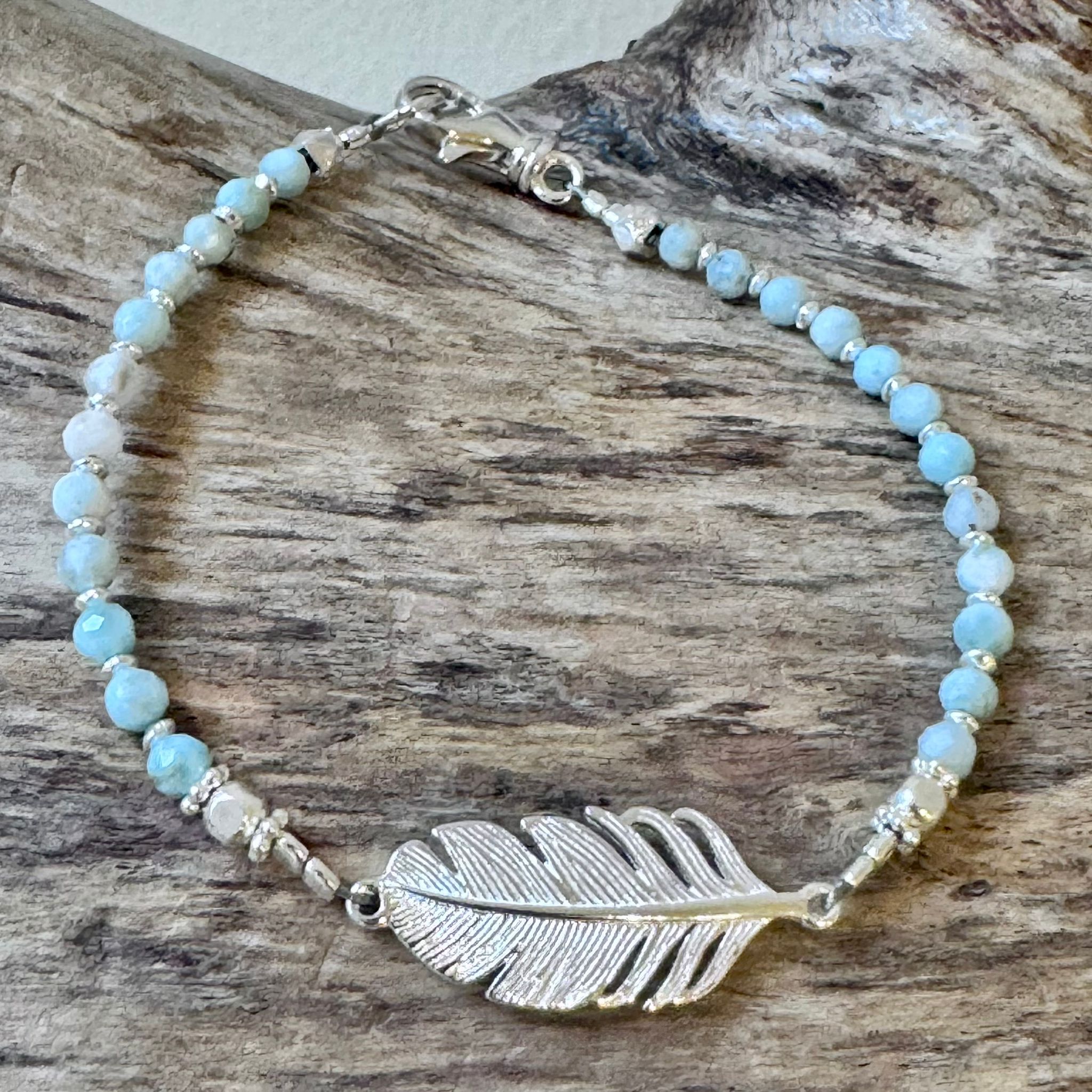 Dieses schöne Armband haben wir aus facettiertem Larimar (3mm), sehr vielen Zwischenstücken aus Sterlingsilber und einem Verbindungselement "Feder" aus Sterlingsilber (25x10mm) kreiert. Das Armand hat eine Länge von 17,5cm.