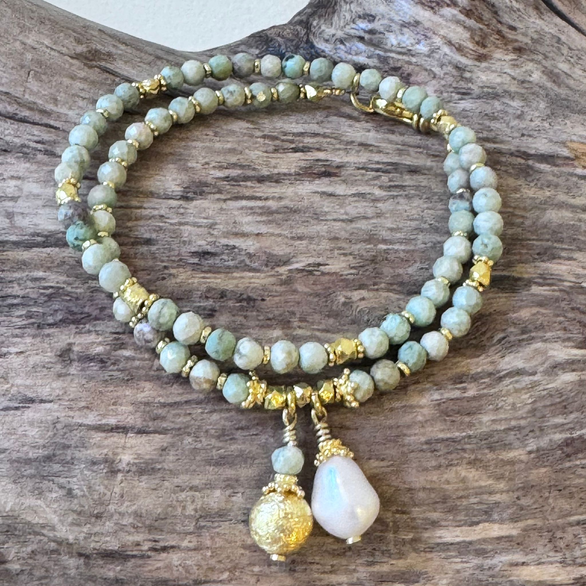 Dieses schöne Armband haben wir aus facettiertem peruanischem Türkis (3,5mm), sehr vielen Zwischenstücken aus vergoldetem Sterlingsilber, einem Charm aus einer tropfenförmigen Süsswasserperle (14x7mm) und einem Charm aus einem peruanischen Türkis und einem Element aus mattiertem Sterlingsilber (15x8mm) kreiert. Das Armband hat eine Länge von 35,8cm und wird zweimal um das Handgelenk gewickelt.