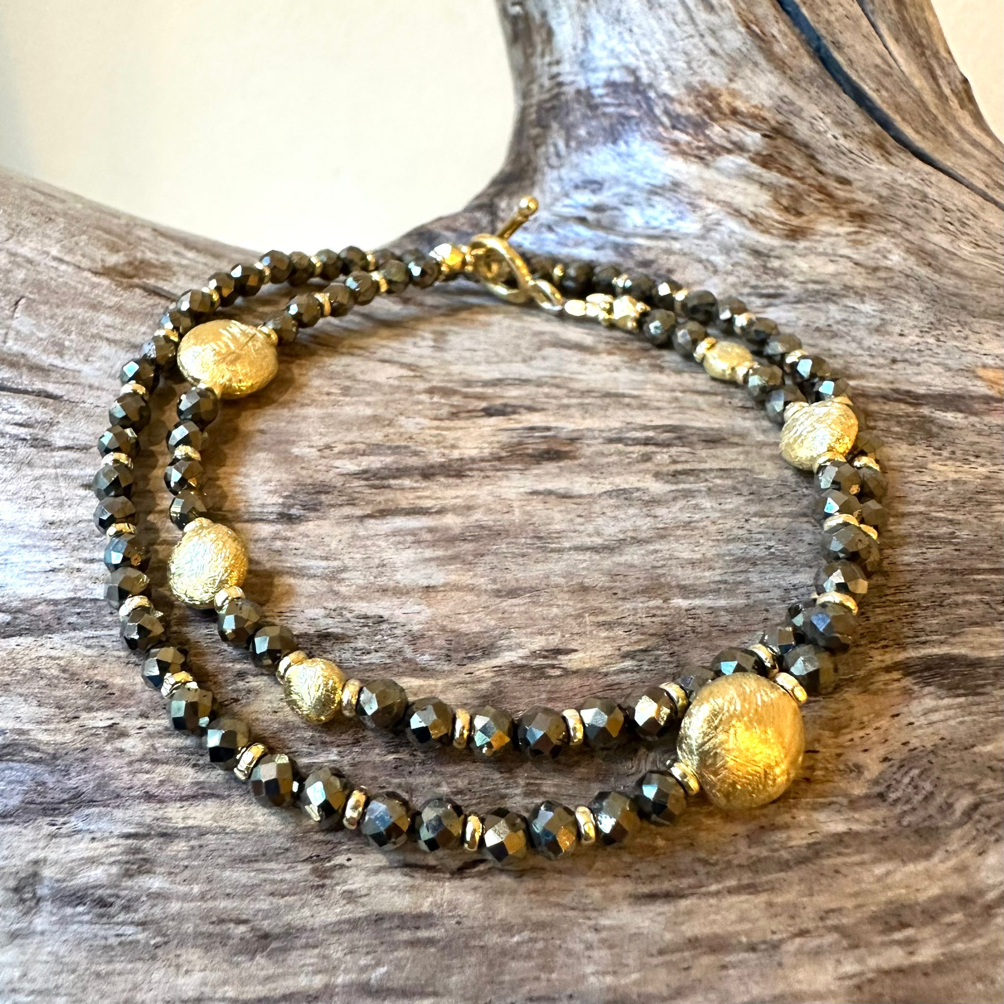 Dieses schöne Armband haben wir aus facettiertem Pyrit (3mm), vielen Zwischenstücken aus vergoldetem Sterlingsilber, münzförmigen Elementen aus mattiertem vergoldetem Sterlingsilber (4-8mm) und einem dekorativem Ring-Stab-Verschluss aus vergoldetem Sterlingsilber kreiert. Das Armband hat eine Länge von 35,2cm und wird zweimal um das Hangelenk gewickelt.