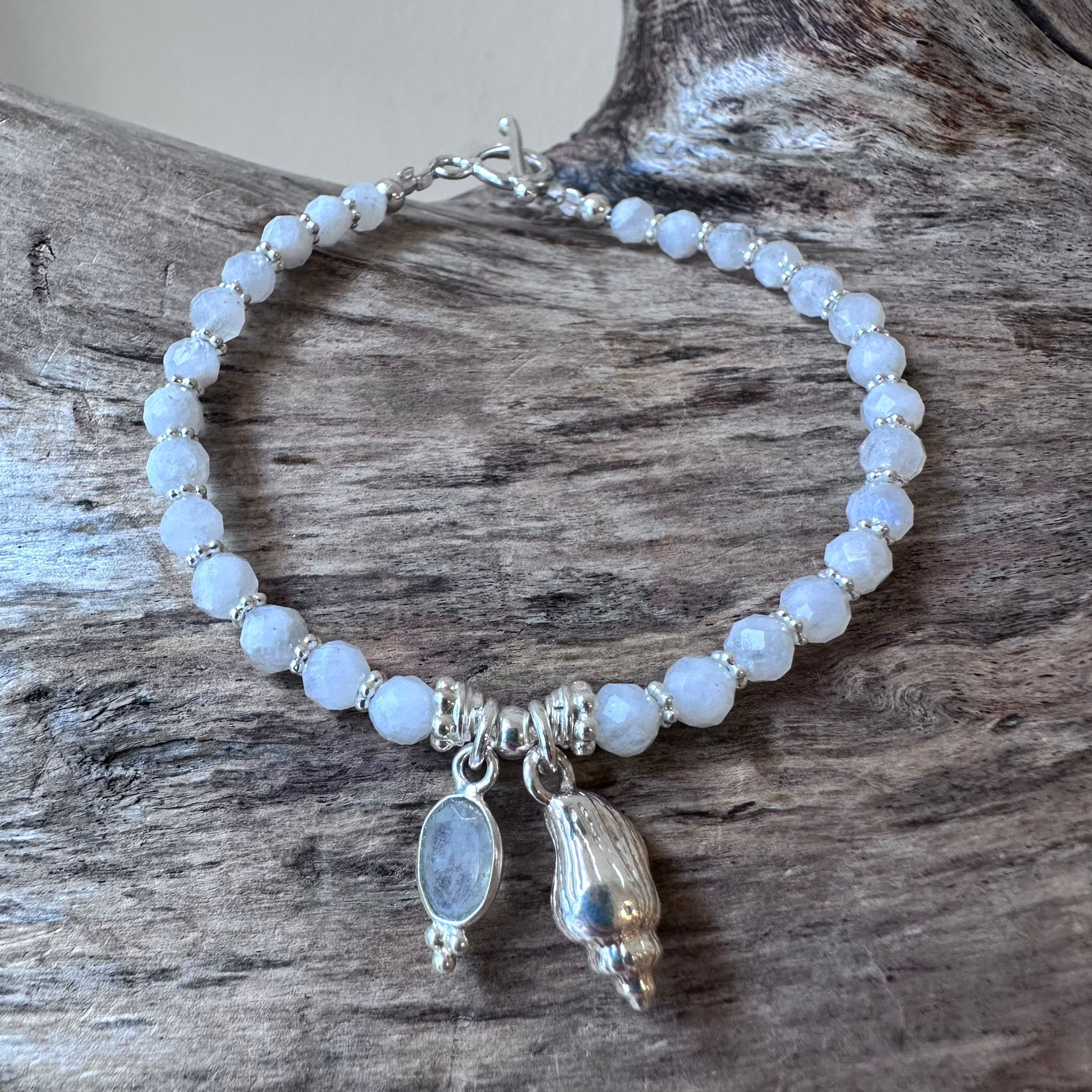 Dieses schöne Armband haben wir aus facettiertem Regenbogen-Mondstein (4mm), sehr vielen Zwischenstücken aus Sterlingsilber, einem Charm aus facettiertem Regenbogen-Mondstein (7x5mm), einem Muschel-Charm aus Sterlingsilber (15x7mm) und einem dekorativem Ring-Stab-Verschluss aus Sterlingsilber kreiert. Das Armband hat eine Länge von 18cm.
