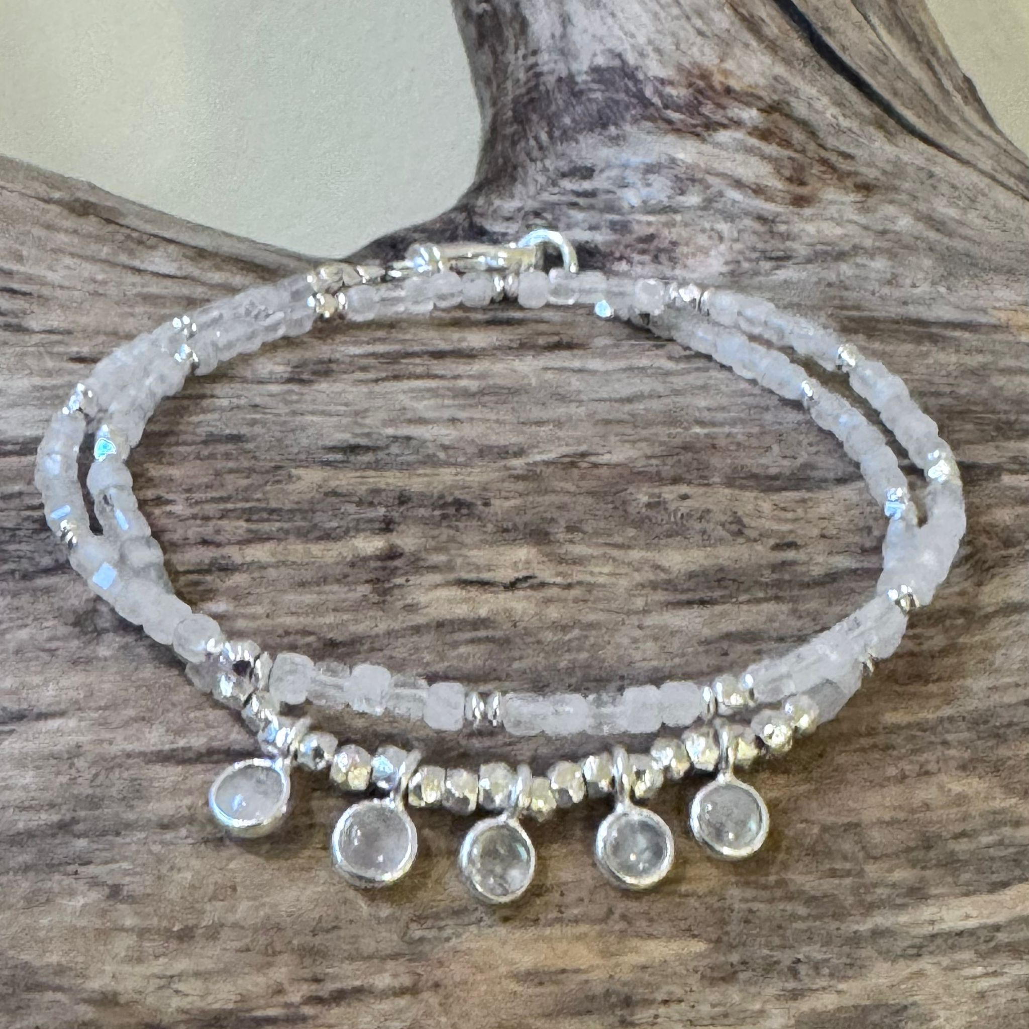 Dieses schöne Armband haben wir aus facettiertem Regenbogen-Mondstein in Würfelform (2mm), Zwischenstücken aus Sterlingsilber und Charms aus poliertem Regenbogen-Mondstein (5mm) kreiert. Das Armband hat eine Länge von 35cm und wird zweimal um das Handgelenk gewickelt.