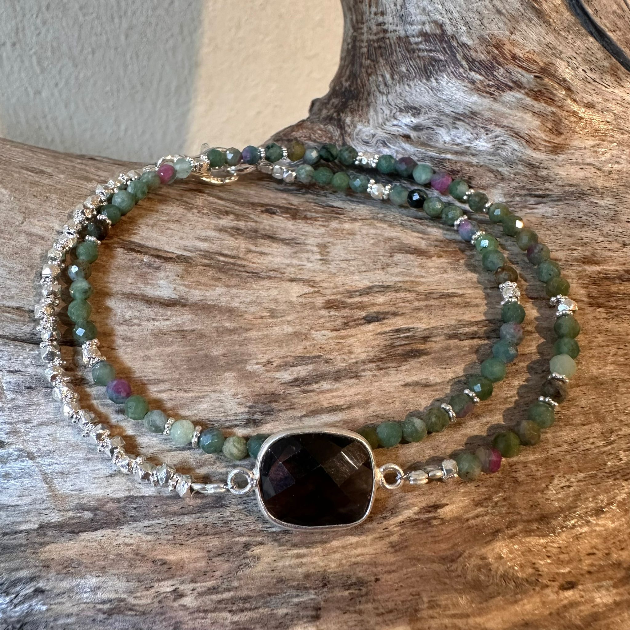 Dieses schöne Armband haben wir aus facettiertem Rubin-Zoisit (3mm), Zwischenstücken aus Sterlingsilber und einem Verbindungselement aus facettiertem Rauchquarz (13x8mm) kreiert. Das Armband hat eine Länge von 35cm und wird zweimal um das Handgelenk gewickelt.