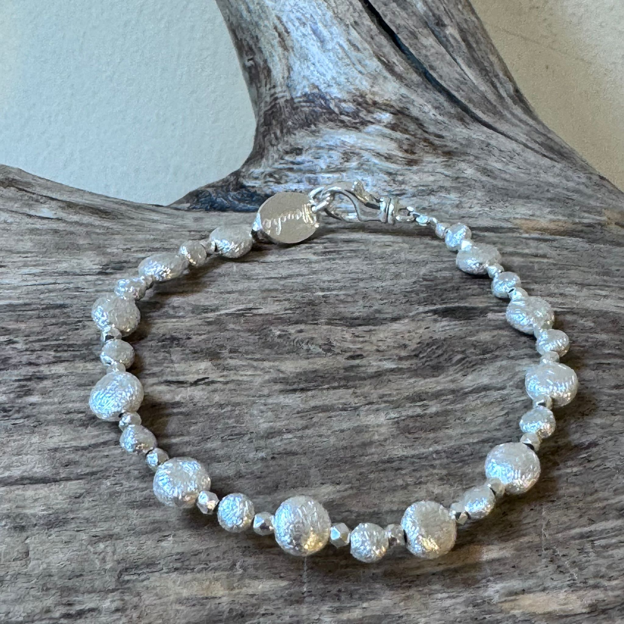 Dieses schöne Armband haben wir aus münzförmigen Elementen aus mattiertem Sterlingsilber (3,5mm und 6mm) und Zwischenstücken aus facettiertem Sterlingsilber (2mm) kreiert. Das Armband hat eine Länge von 18cm.