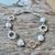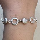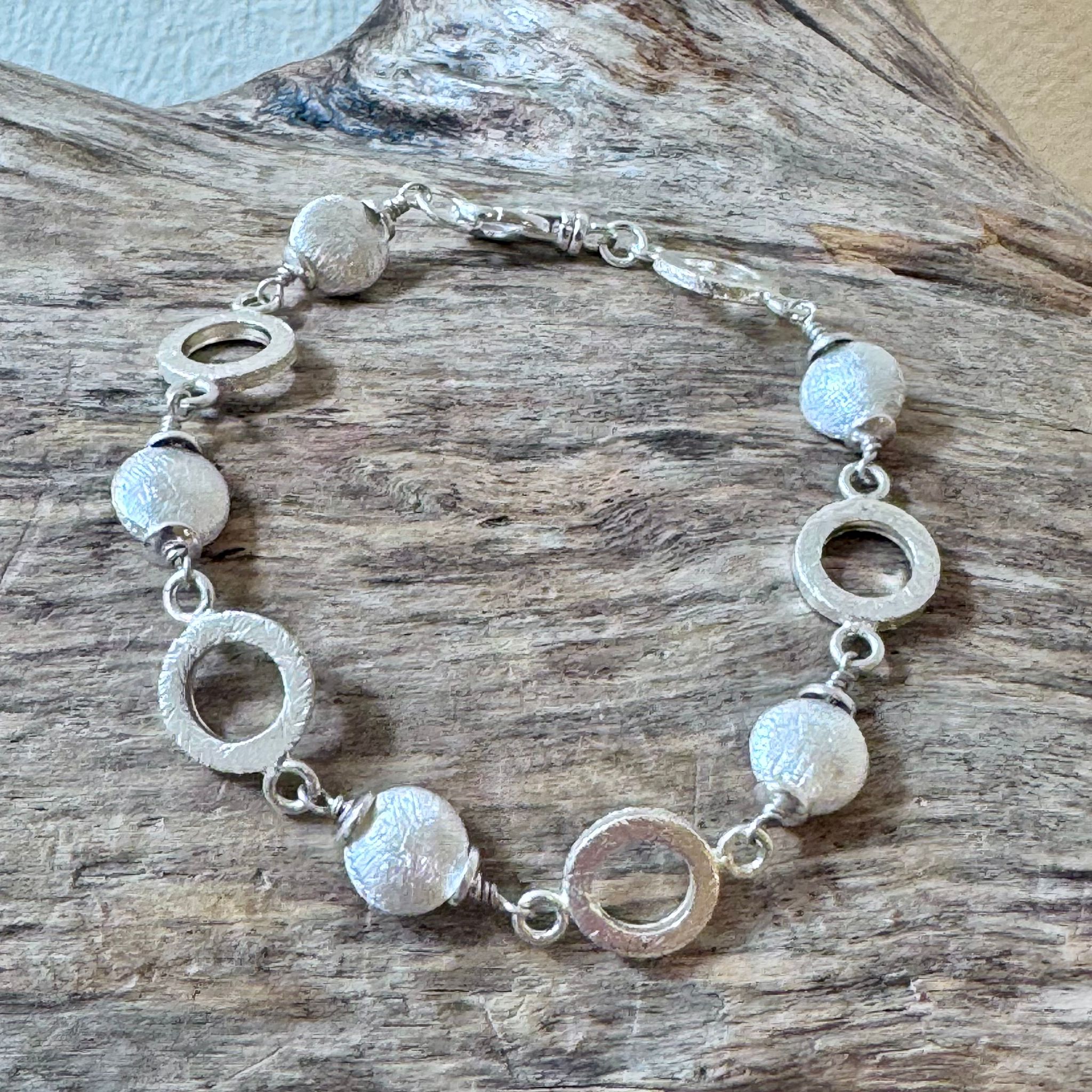 Dieses schöne Armband haben wir aus Elementen aus mattiertem Sterlingsilber (8mm und 10mm) kreiert. Das Armband hat eine Länge von 17,5cm.
