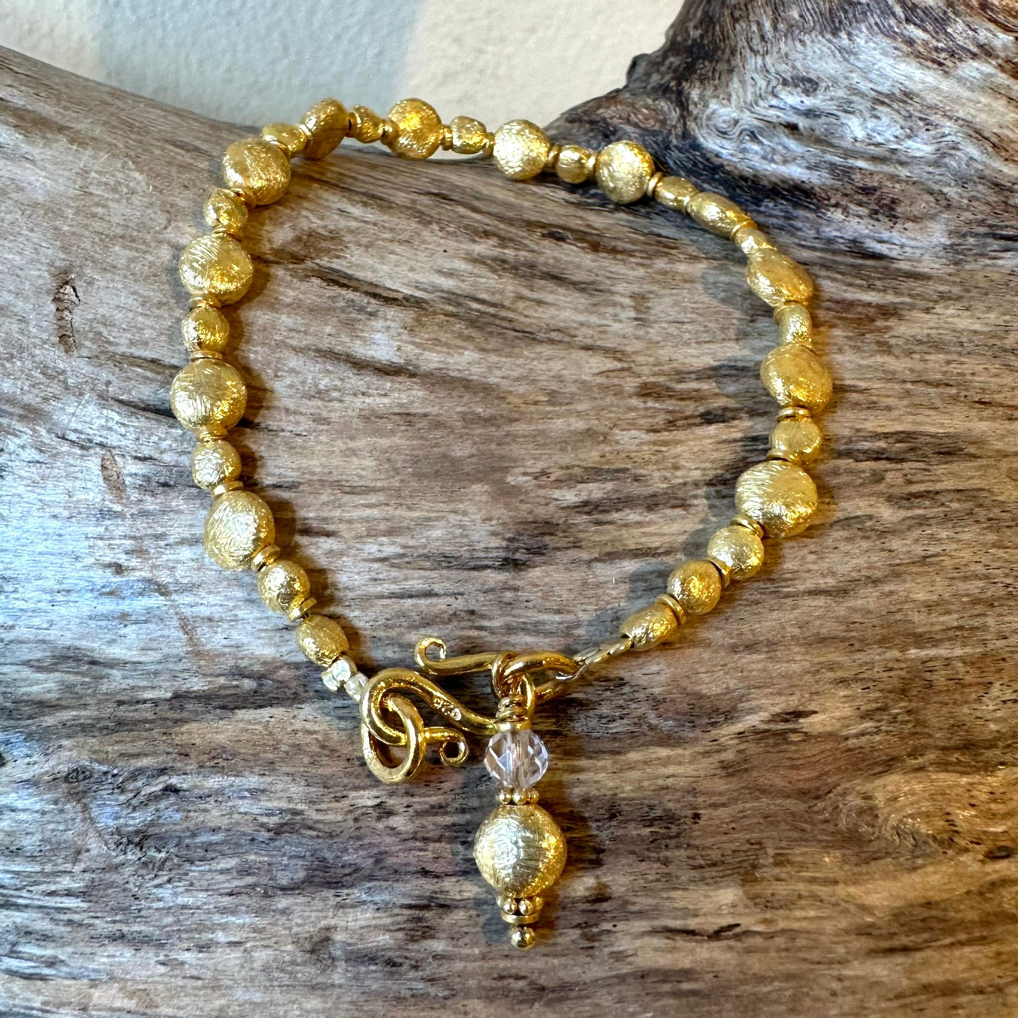 Dieses schöne Armband haben wir aus münzförmigen Elementen aus mattiertem vergoldetem Sterlingsilber (4mm und 6mm), einem facettiertem Bergkristall (3mm) und einem dekorativen S-Verschluss aus vergoldetem Sterlingsilber kreiert. Das Armband hat eine Länge von 18cm.