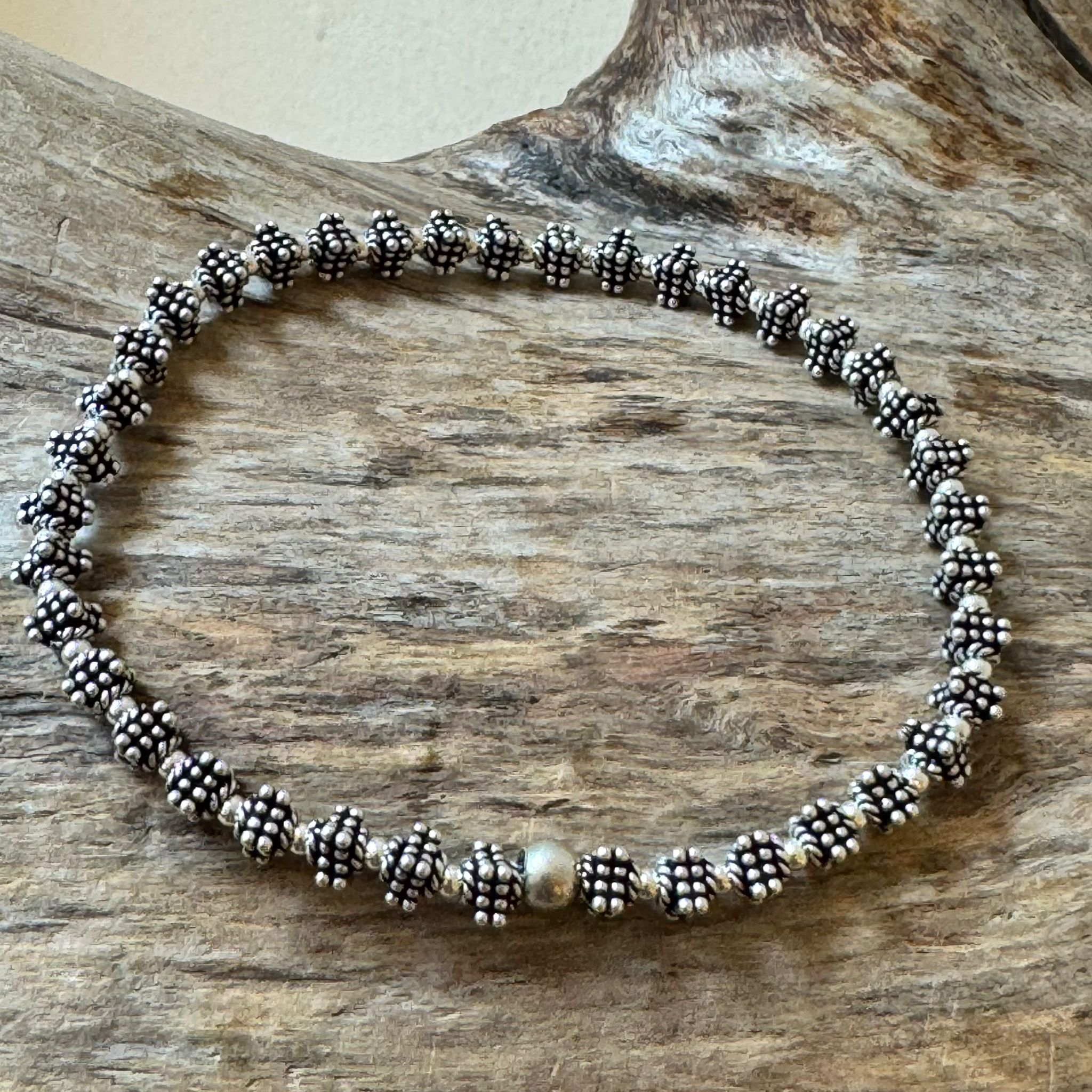 Dieses schöne elastische Armband haben wir aus Elementen aus oxidiertem Sterlingsilber (3x4mm) und Kugeln aus poliertem Sterlingsilber (2mm und 5mm) kreiert. Das Armband hat eine Länge von 19,5cm.