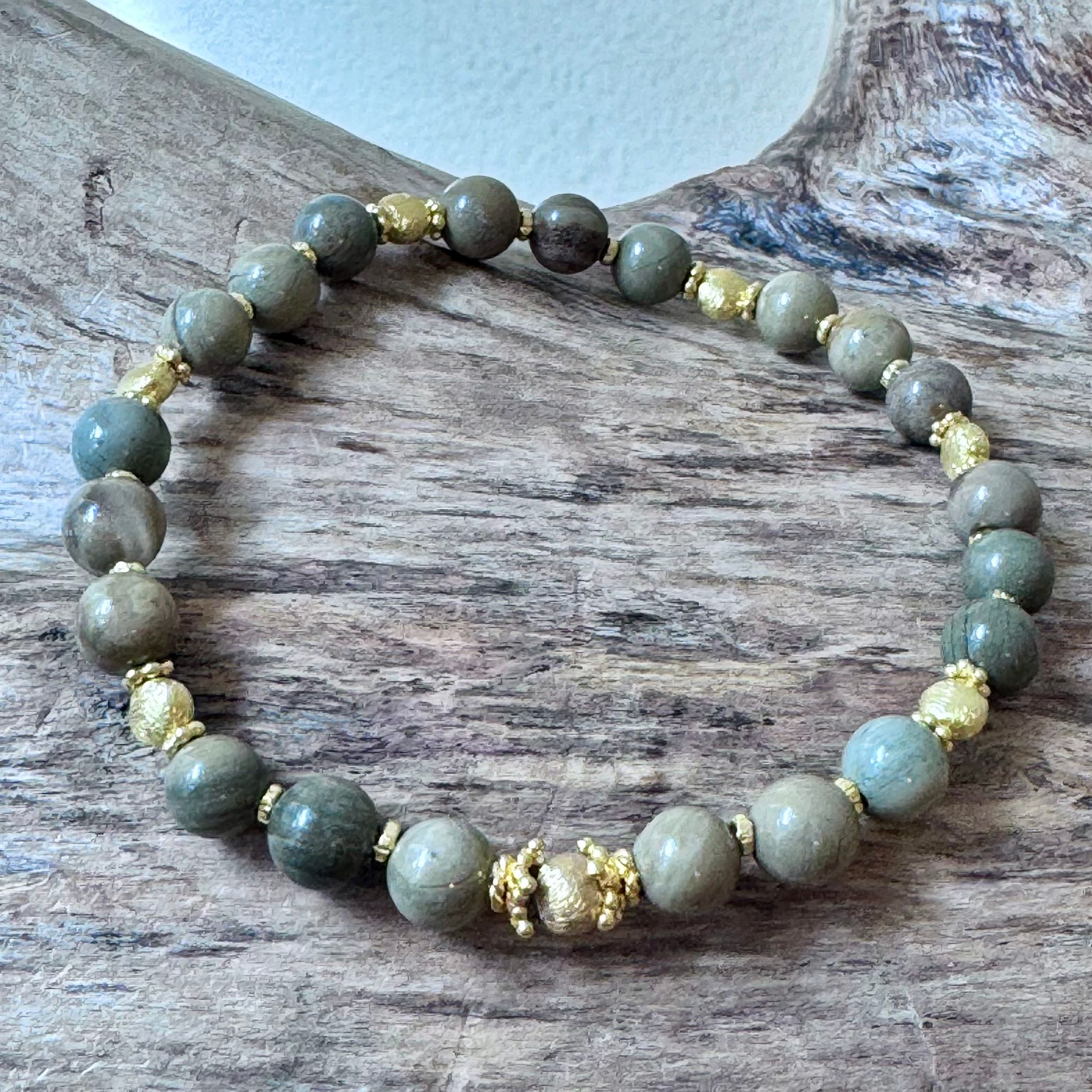 Dieses schöne elastische Armband haben wir aus poliertem Jaspis (6mm), sehr vielen Zwischenstücken aus vergoldetem Sterlingsilber und Elementen aus mattiertem vergoldetem Sterlingsilber (3mm und 5mm) kreiert. Das Armband hat eine Länge von 17,5cm.