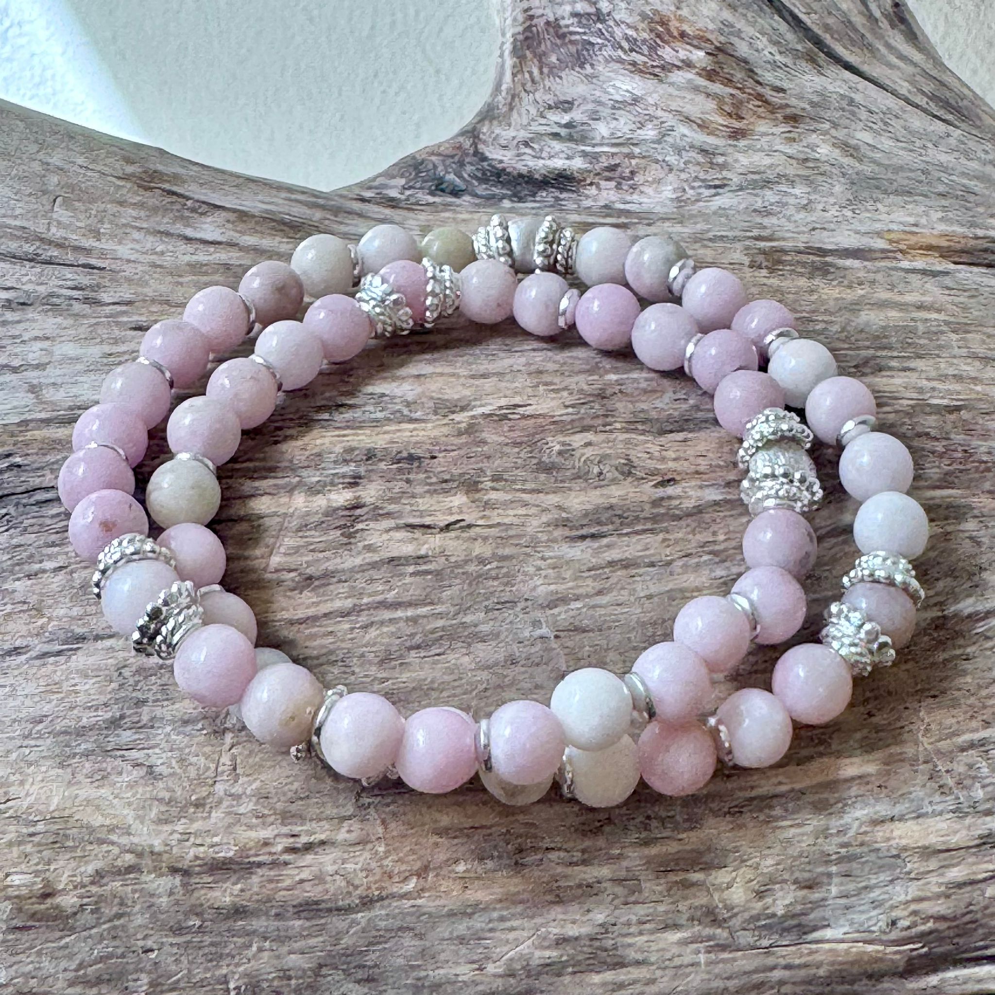 Dieses schöne elastische Armband haben wir aus poliertem rosa Calcit (6mm), sehr vielen Zwischenstücken aus Sterlingsilber und Elementen aus mattiertem Sterlingsilber (6mm) kreiert. Das Armband hat eine Länge von 35cm und wird zweimal um das Handgelenk gewickelt.