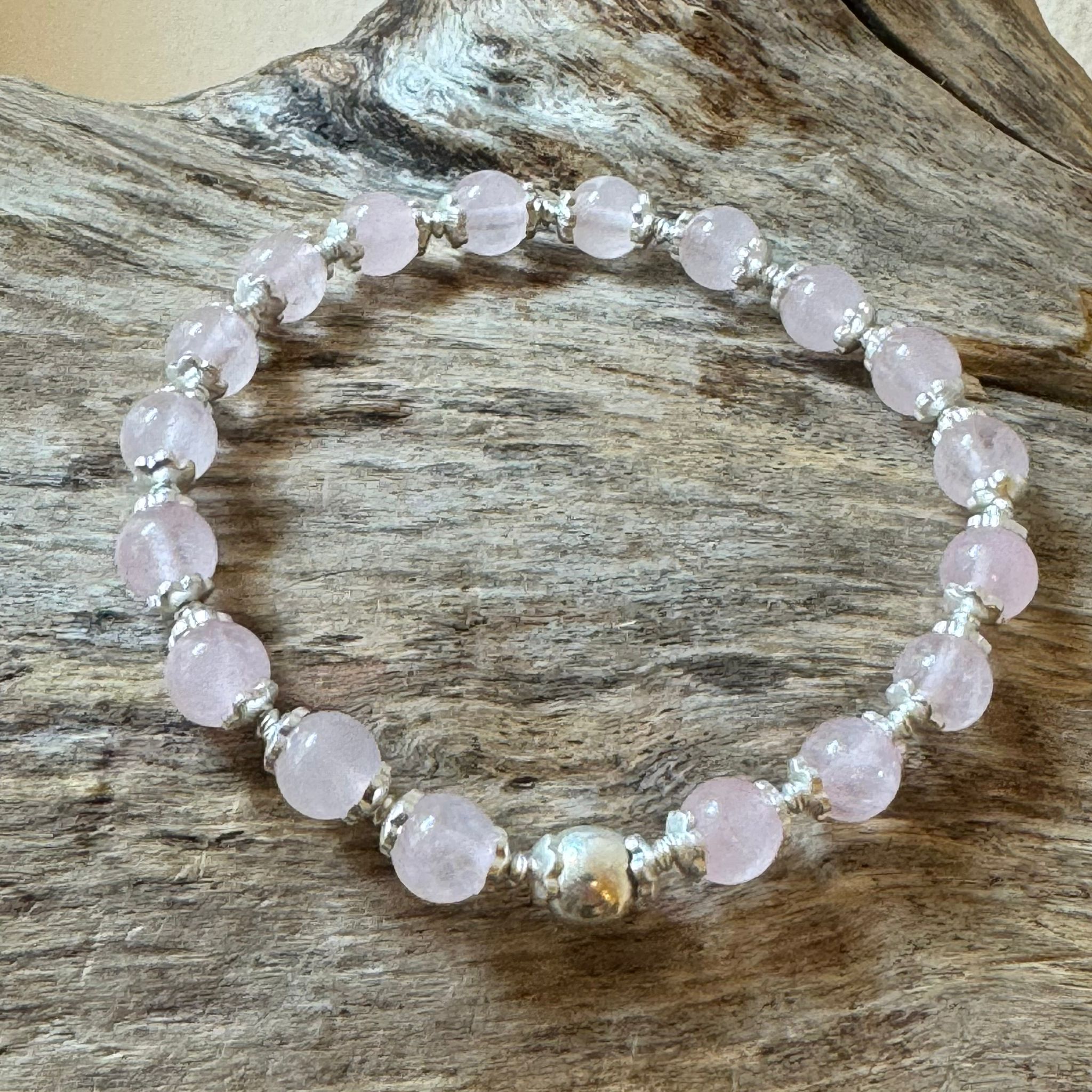 Dieses schöne elastische Armband haben wir aus poliertem Rosenquarz (6mm), einer Kugel aus Sterlingsilber (5,5mm) und vielen Zwischenstücken aus Sterlingsilber kreiert. Das Armband hat eine Länge von 17,5cm.