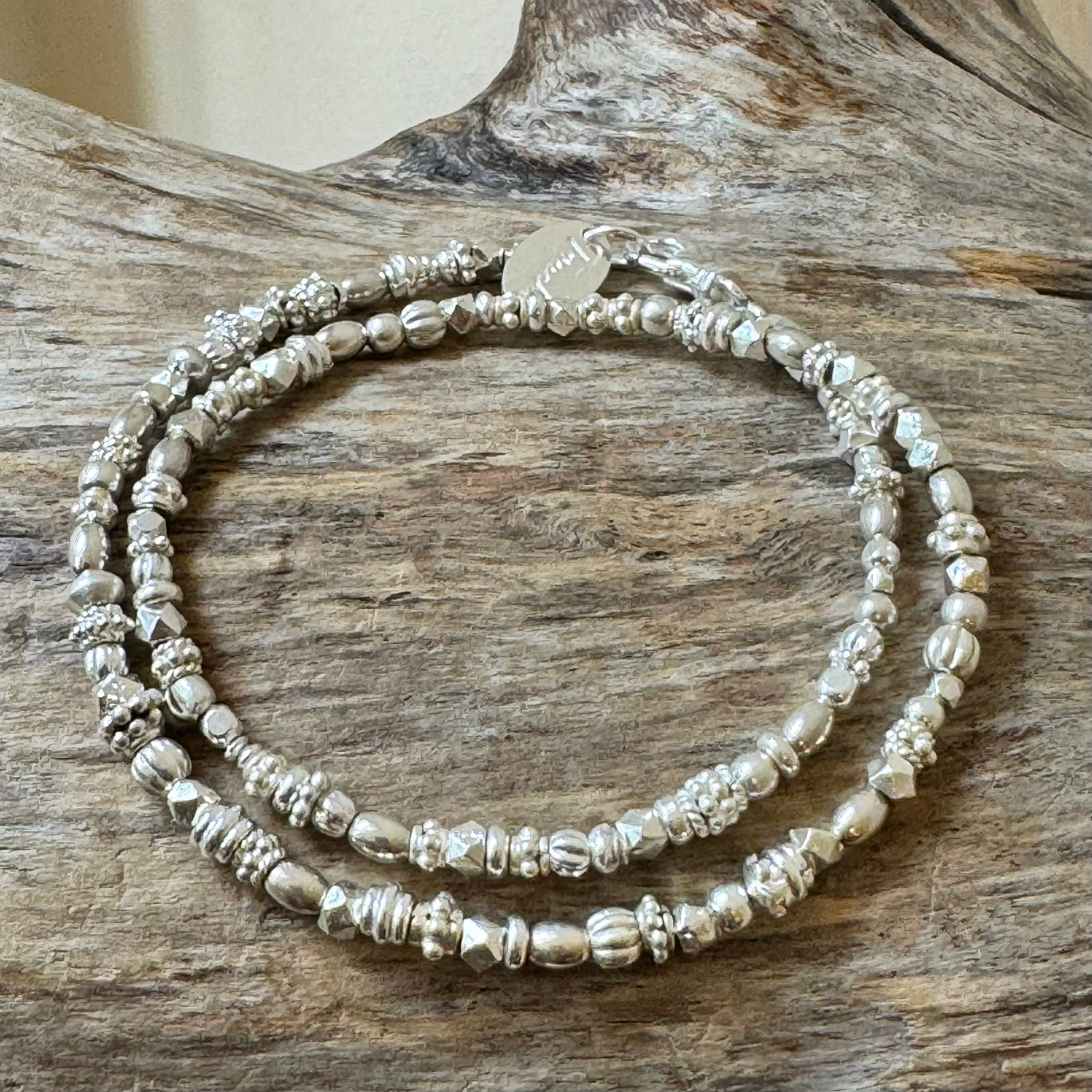 Dieses schöne Armband haben wir aus Zwischenstücken und Elementen aus Sterlingsilber (3-5mm) kreiert. Das Armband hat eine Länge von 35,5cm und wird zweimal um das Handgelenk gewickelt.