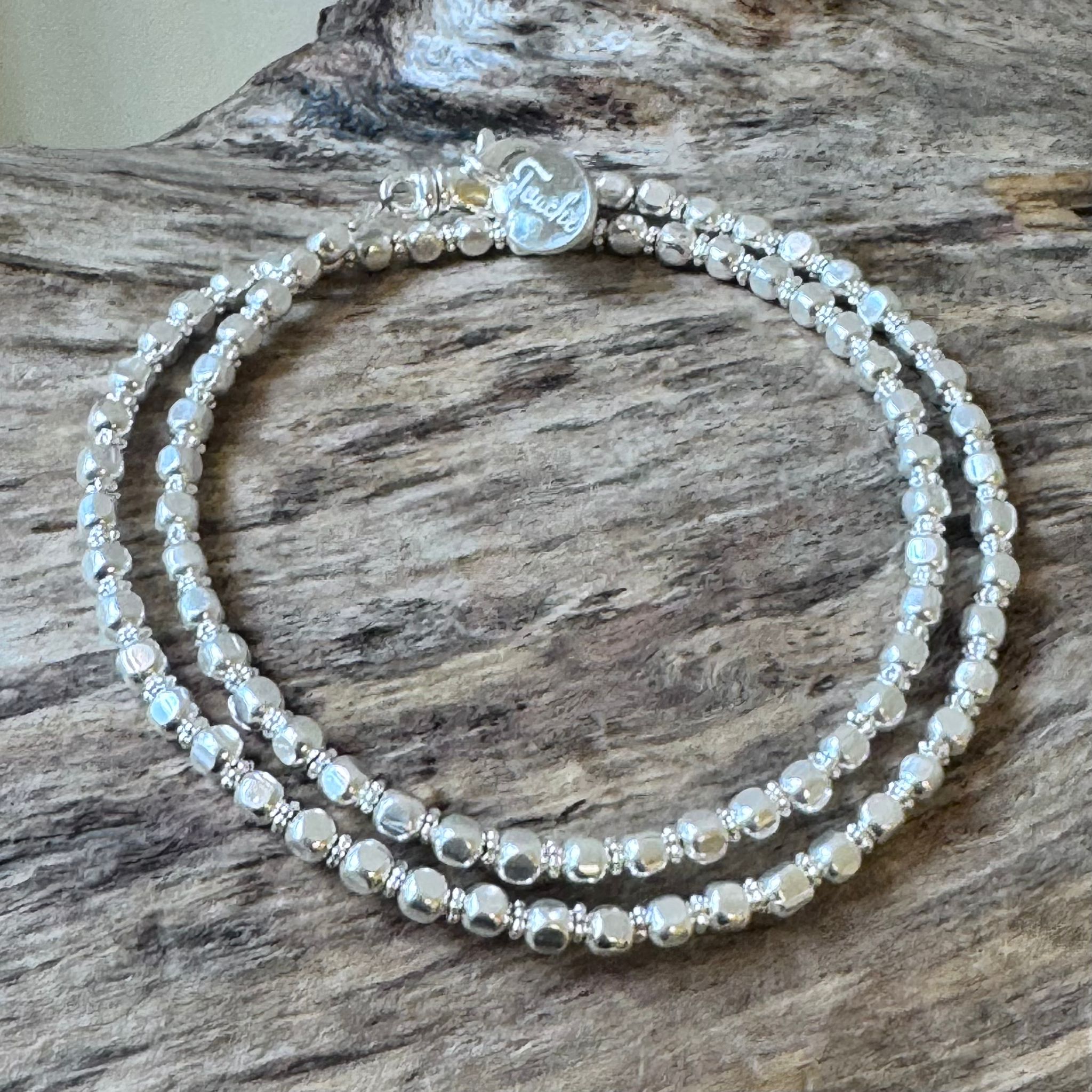 Diese schöne Armband haben wir aus würfelförmigen Elementen aus Sterlingsilber (3mm) und Zwischenstücken aus Sterlingsilber kreiert. Das Armband hat eine Länge von 35cm und wird zweimal um das Handgelenk gewickelt.