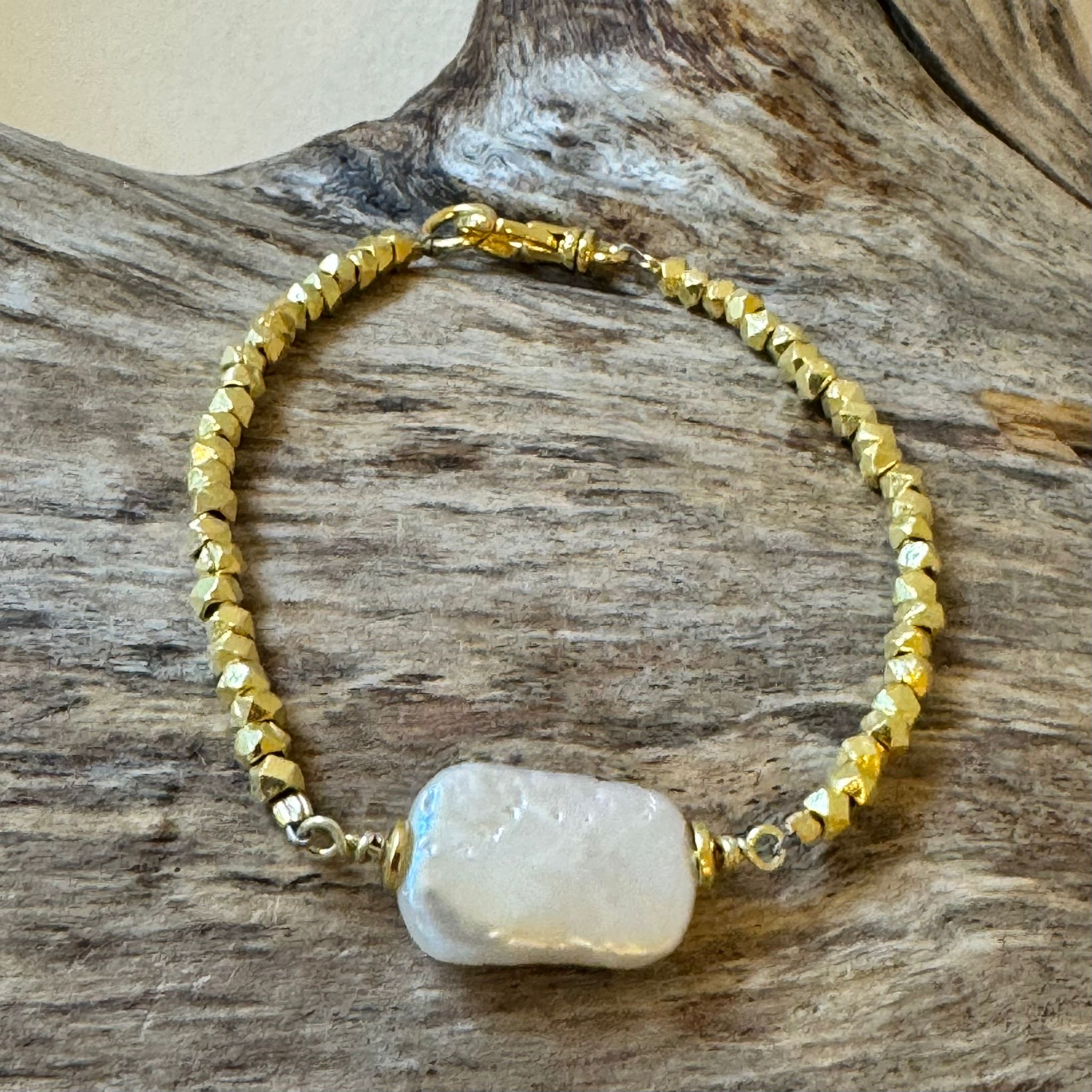 Dieses schöne Armband haben wir aus einer rechteckigen Süsswasserperle (15x10mm) und facettiertem vergoldetem Sterlingsilber (3mm) kreiert. Das Armband hat eine Länge von 17,4cm.