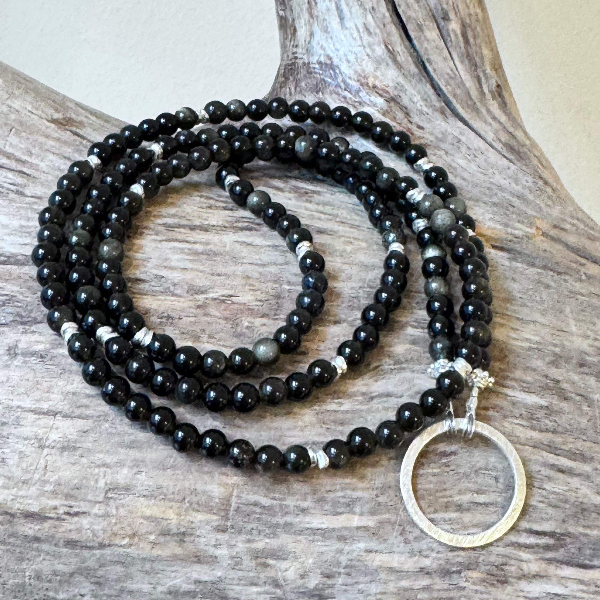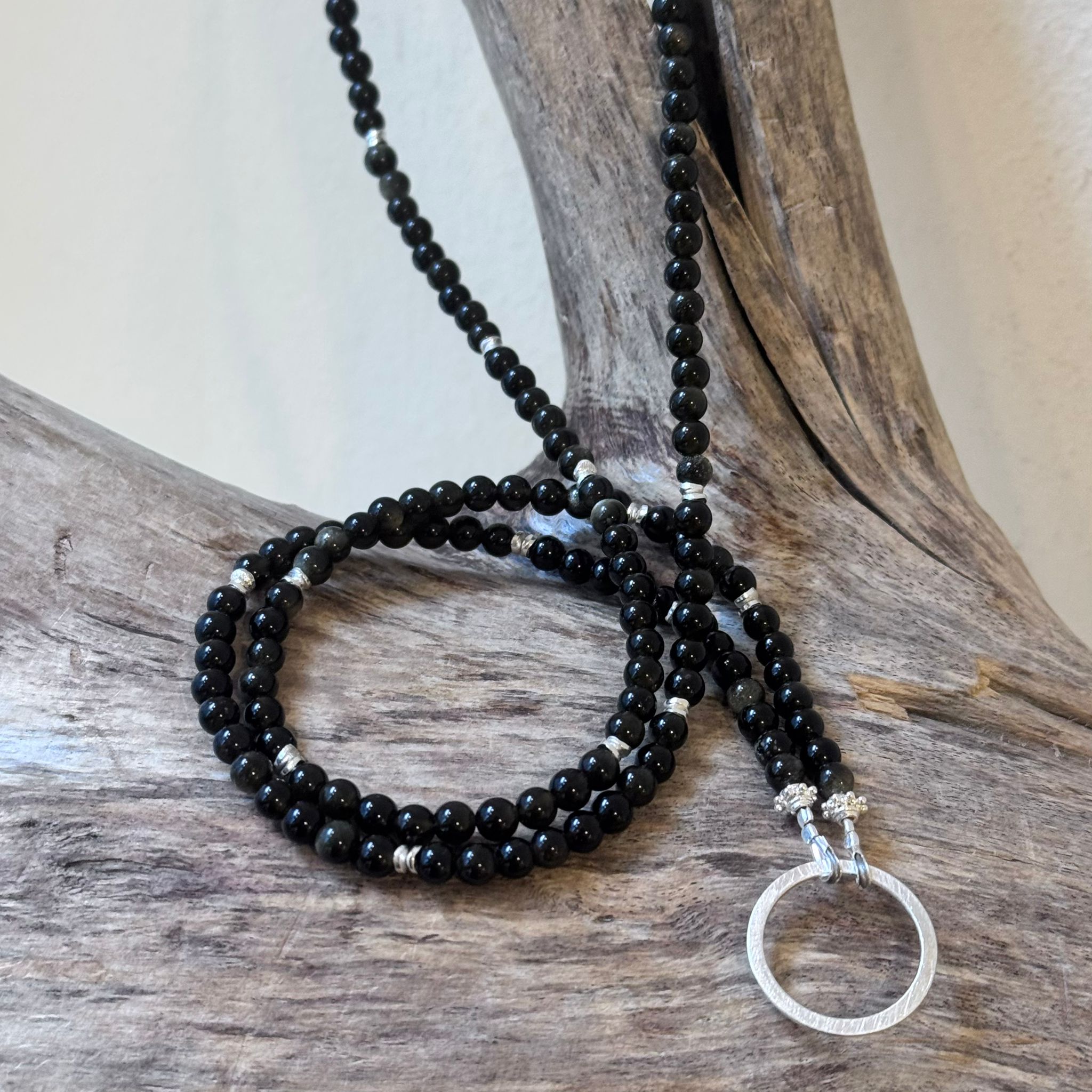 Diese schöne Brillenkette haben wir aus poliertem Goldobsidian (4mm), Zwischenstücken aus Sterlingsilber und einem Ring aus mattiertem Sterlingsilber (19mm) kreiert. Die Brillenkette hat eine Länge von 77cm.