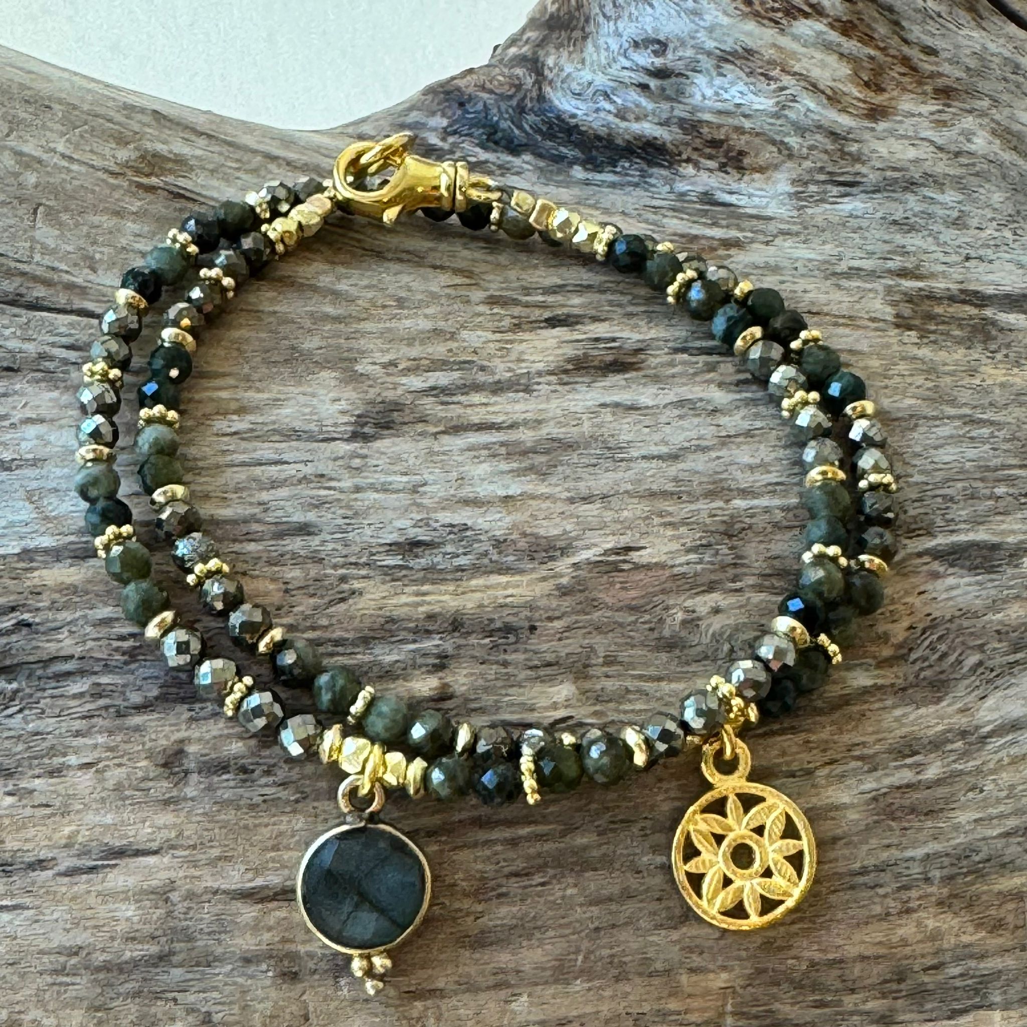 Dieses schöne Armband haben wir aus facettiertem grünem Turmalin (3mm), facettiertem Pyrit (3mm), sehr vielen Zwischenstücken aus vergoldetem Sterlingsilber, einem Charm aus facettiertem Labradorit (10mm) und einem Charm aus mattiertem vergoldetem Sterlingsilber (10mm) kreiert. Das Armband hat eine Länge von 34,5cm und wird zweimal um das Handgelenk gewickelt.