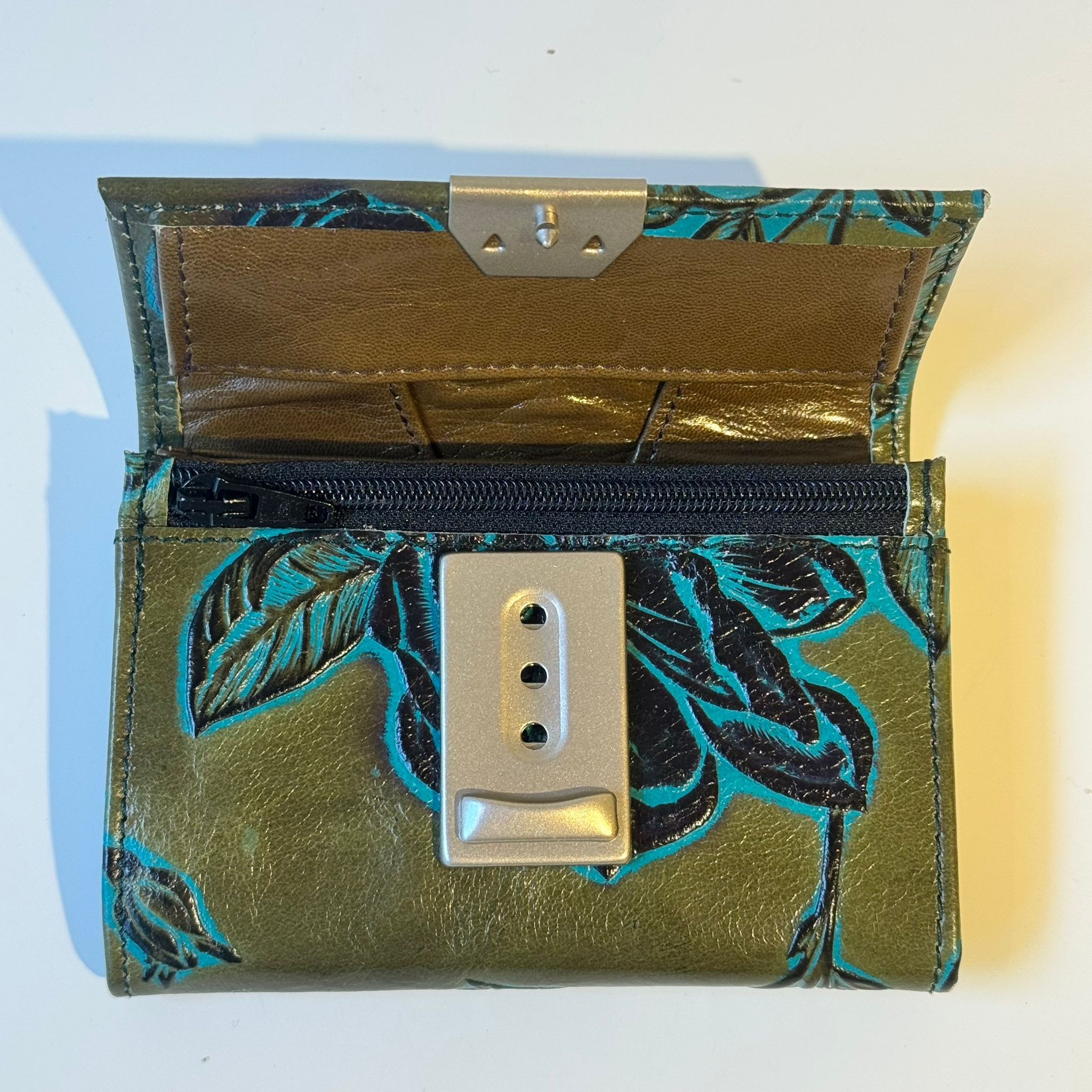 Verschluss: 3fach variabeles Leiterschloss; Innenaufteilung: 1 großes Hartgeldschüttfach, 2 Ziehharmonikafächer mit insgesamt 6 Scheckkartenfächern, unter dem Deckel ein Reissverschlussfach;