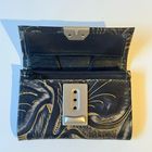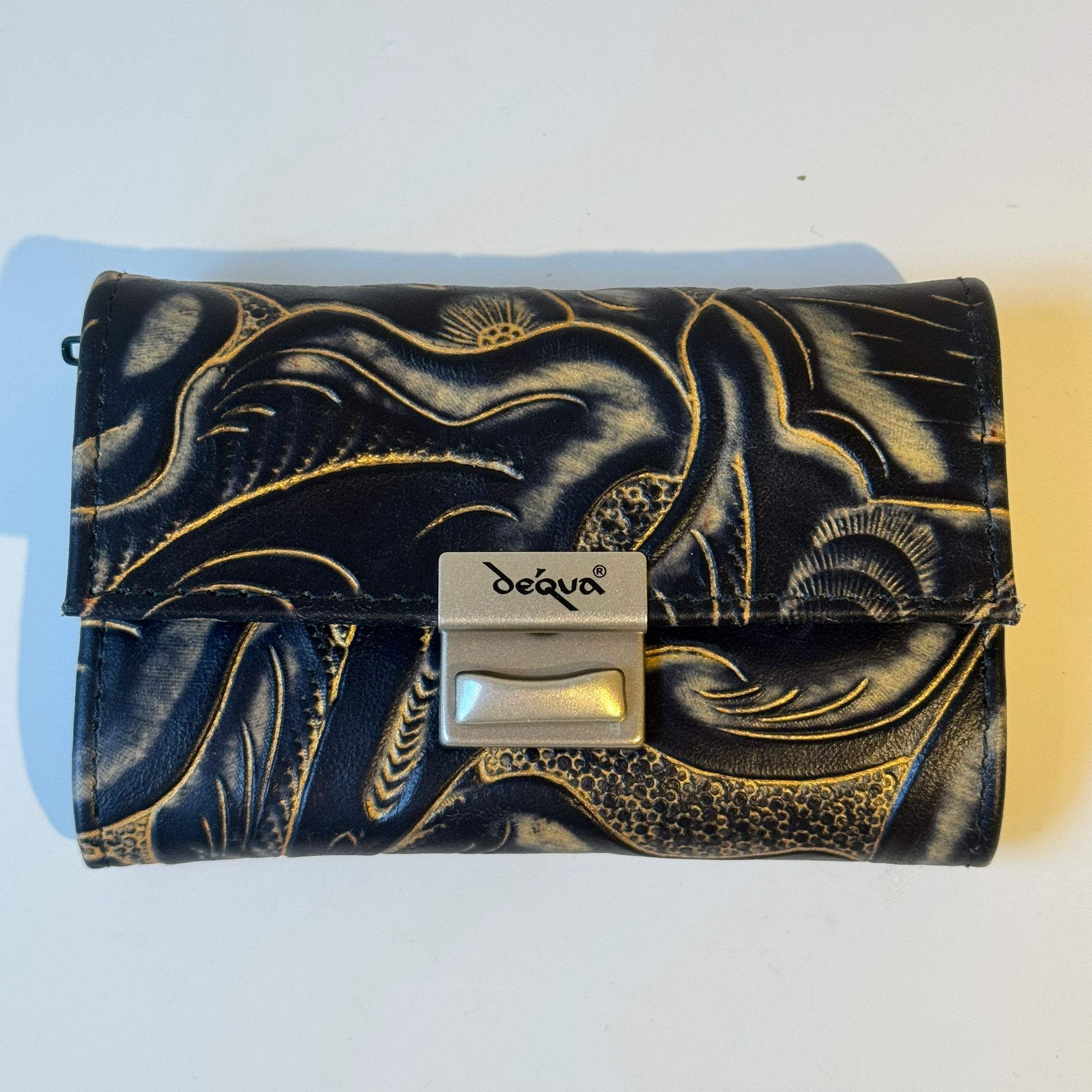 Verschluss: 3fach variabeles Leiterschloss; Innenaufteilung: 1 großes Hartgeldschüttfach, 2 Ziehharmonikafächer mit insgesamt 6 Scheckkartenfächern, unter dem Deckel ein Reissverschlussfach;