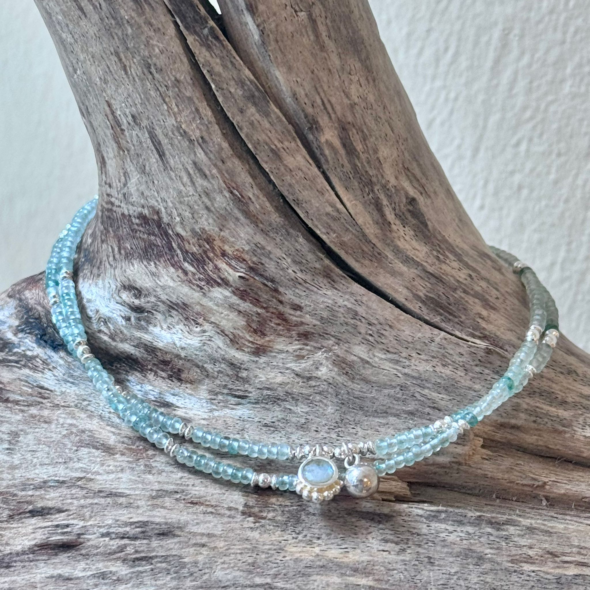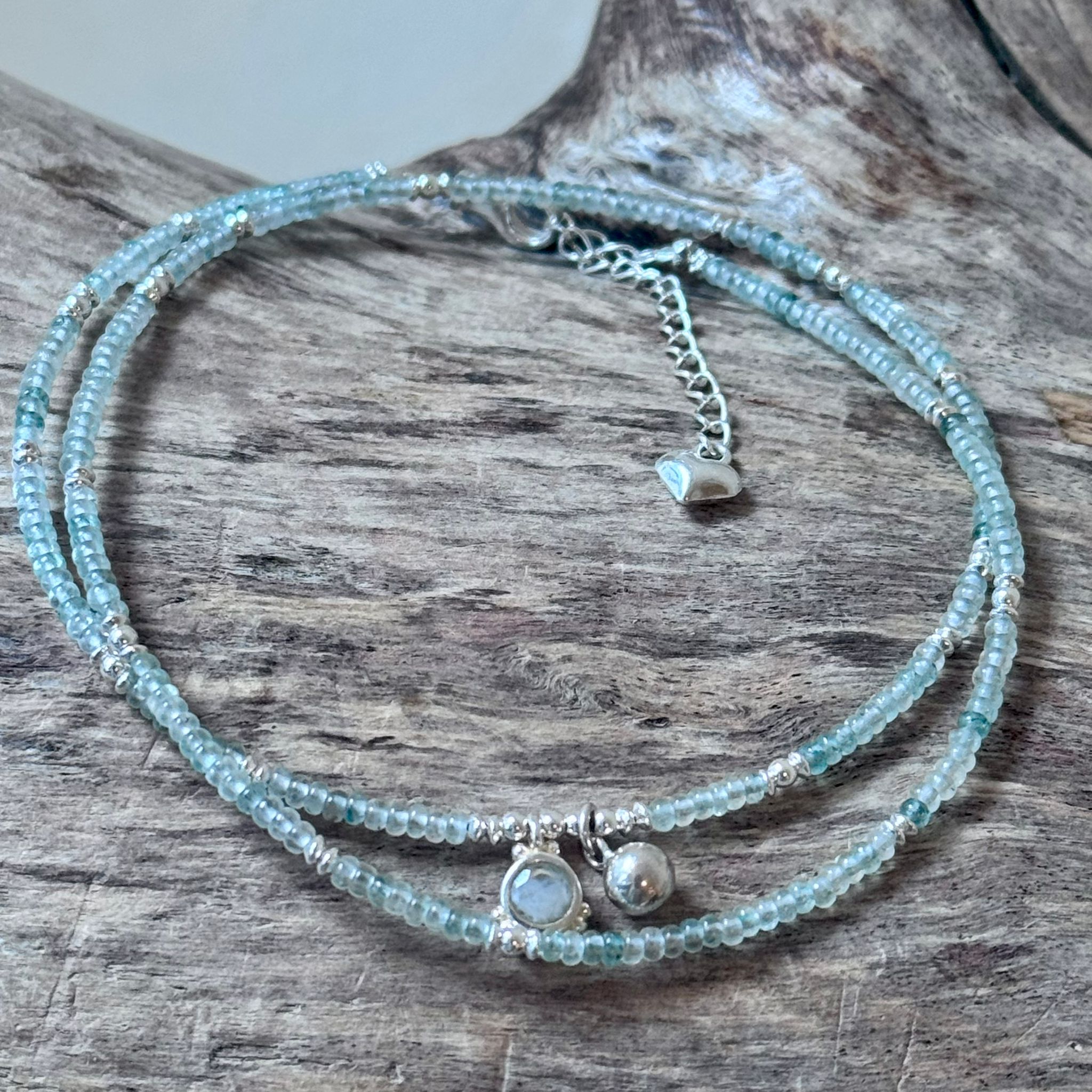 Diese schöne Fusskette haben wir aus poliertem grünem Chalcedon (2mm), vielen Zwischenstücken aus Sterlingsilber, einem Charm aus facettiertem Regenbogen-Mondstein (8mm) und einem Charm aus Sterlingsilber (4mm) kreiert. Die Fusskette wird zweimal um das Fussgelenk gewickelt und hat eine Länge von 44cm bis maximal 48,5cm.