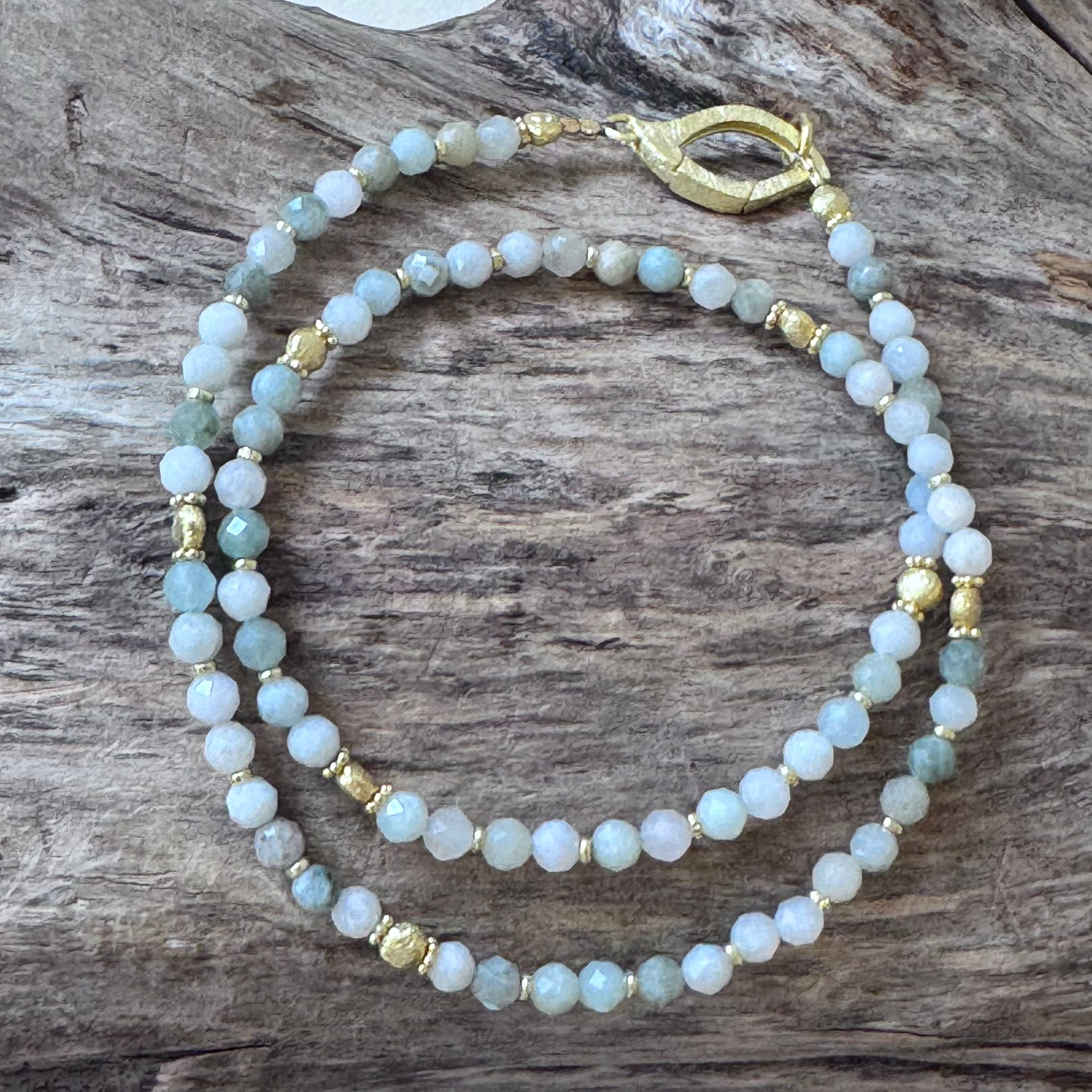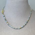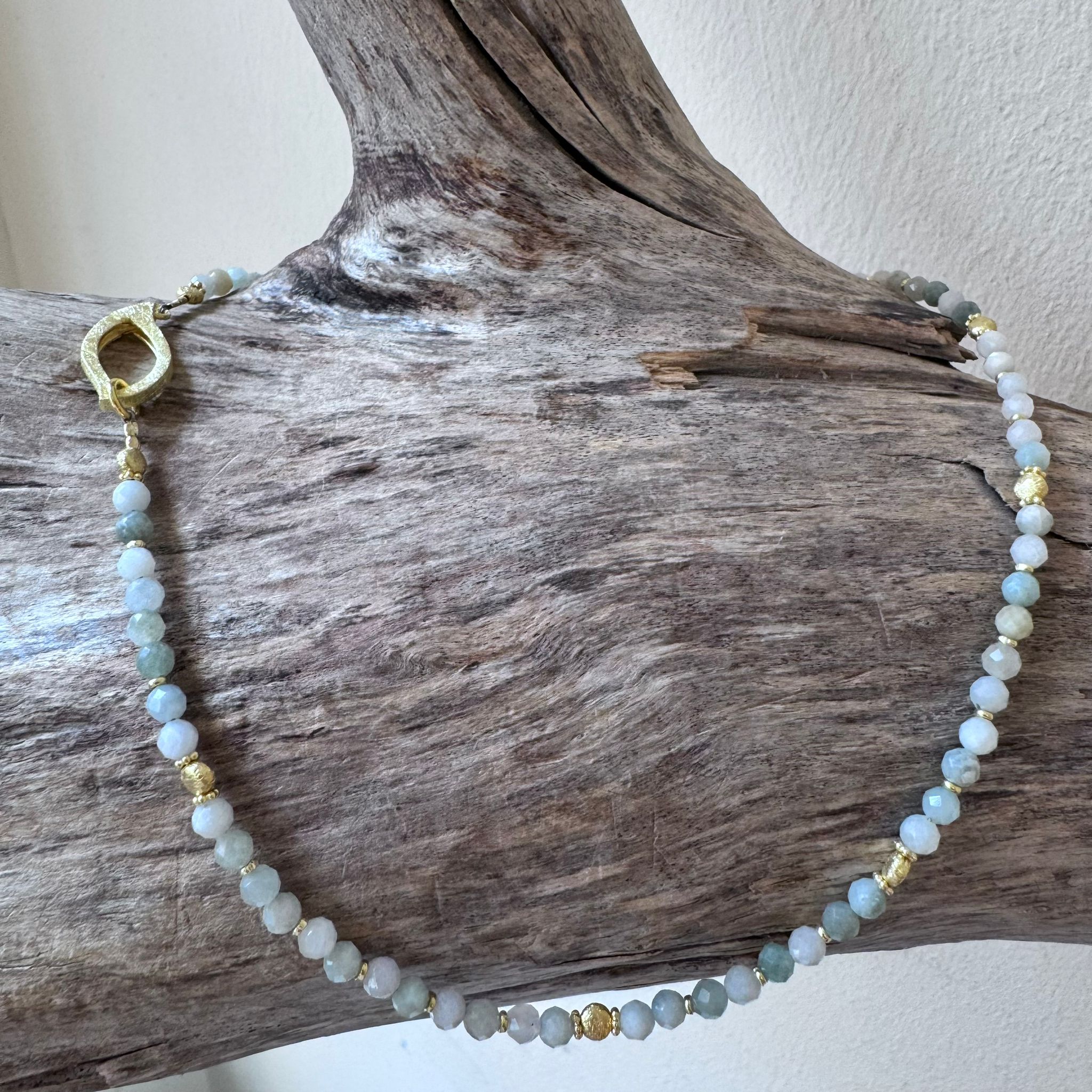 Diese schöne Kette haben wir aus facettierter Buma Jade (4mm), sehr vielen Zwischenstücken aus vergoldetem Sterlingsilber, münzförmigen Elementen aus mattiertem vergoldetem Sterlingsilber (4mm) und einem sehr dekorativem Verschluss aus mattiertem vergoldetem Sterlingsilber kreiert. Die Kette hat eine Länge von 43cm.