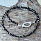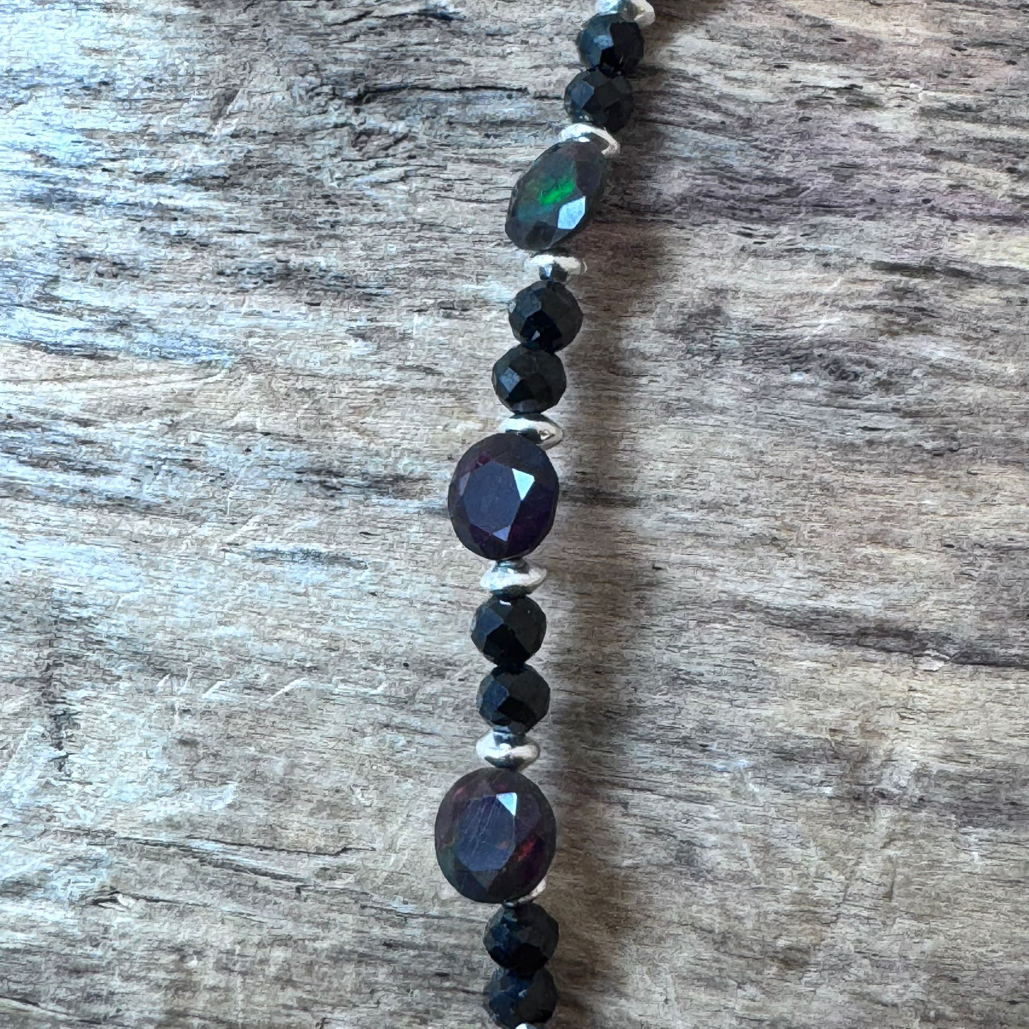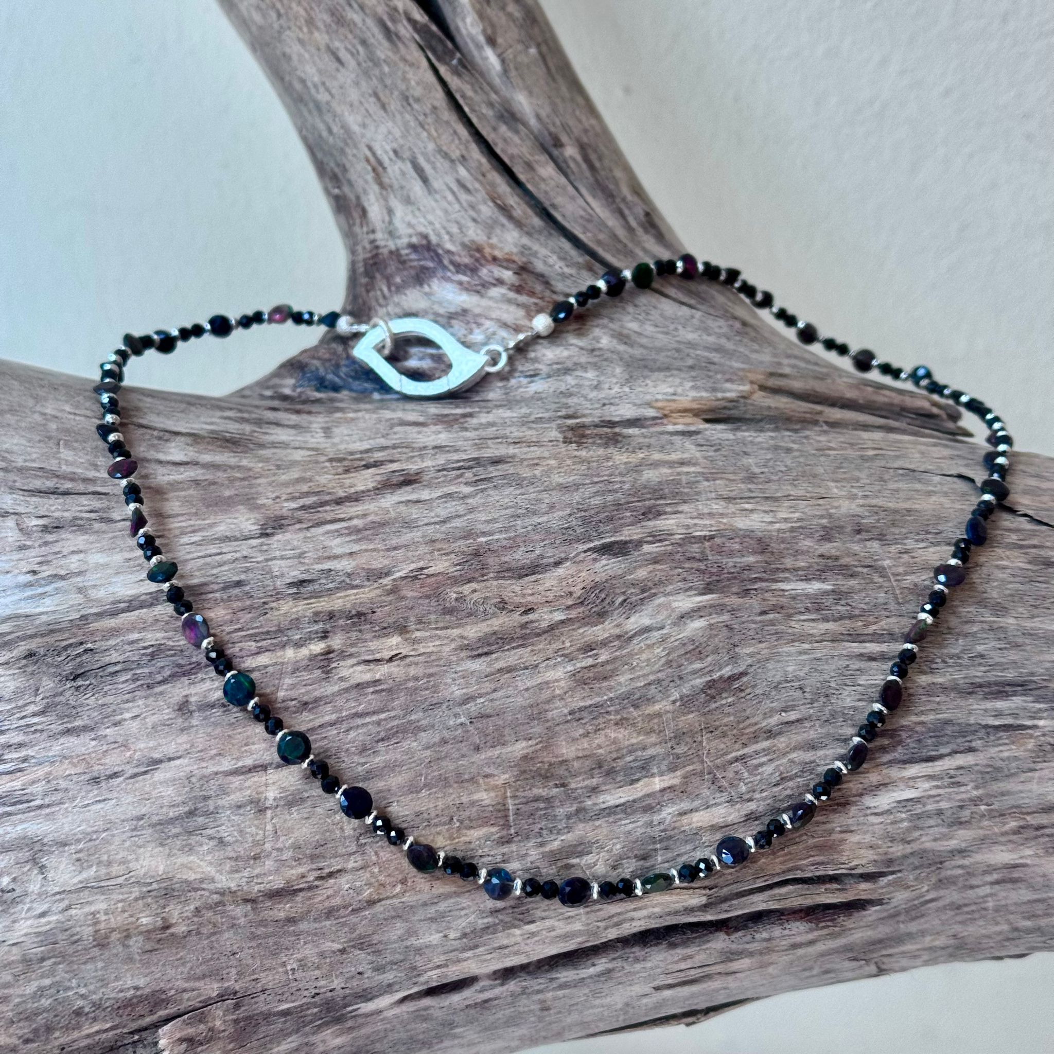 Diese sehr schön funkelnde Kette haben wir aus facettiertem schwarzem äthiopischen Opal (4mm), facettiertem Spinell (2mm), sehr vielen Zwischenstücken aus Sterlingsilber und einem dekorativem Verschluss aus mattiertem Sterlingsilber kreiert. DIe Kette hat eine Länge von 43cm.