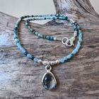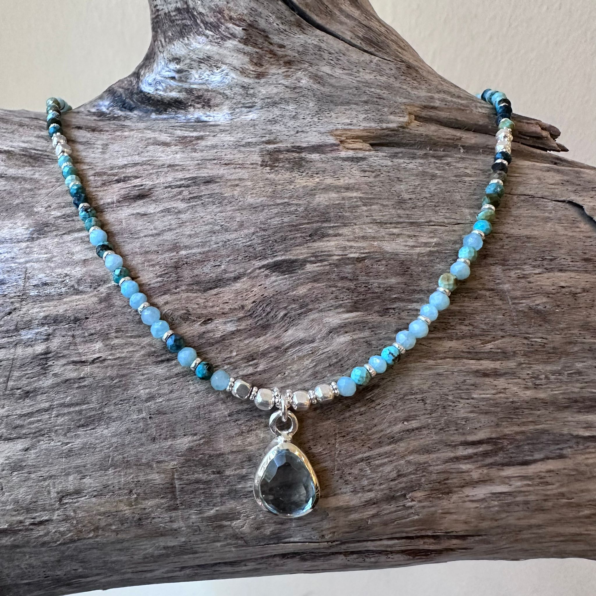 Diese schöne Kette haben wir aus facettiertem Amazonit (3mm), facettiertem Türkis (3mm), vielen Zwischenstücken aus Sterlingsilber und einem Anhänger aus facettiertem hellblauem Topas (12x10mm) kreiert. Die Kette hat eine Länge von 42,5cm.