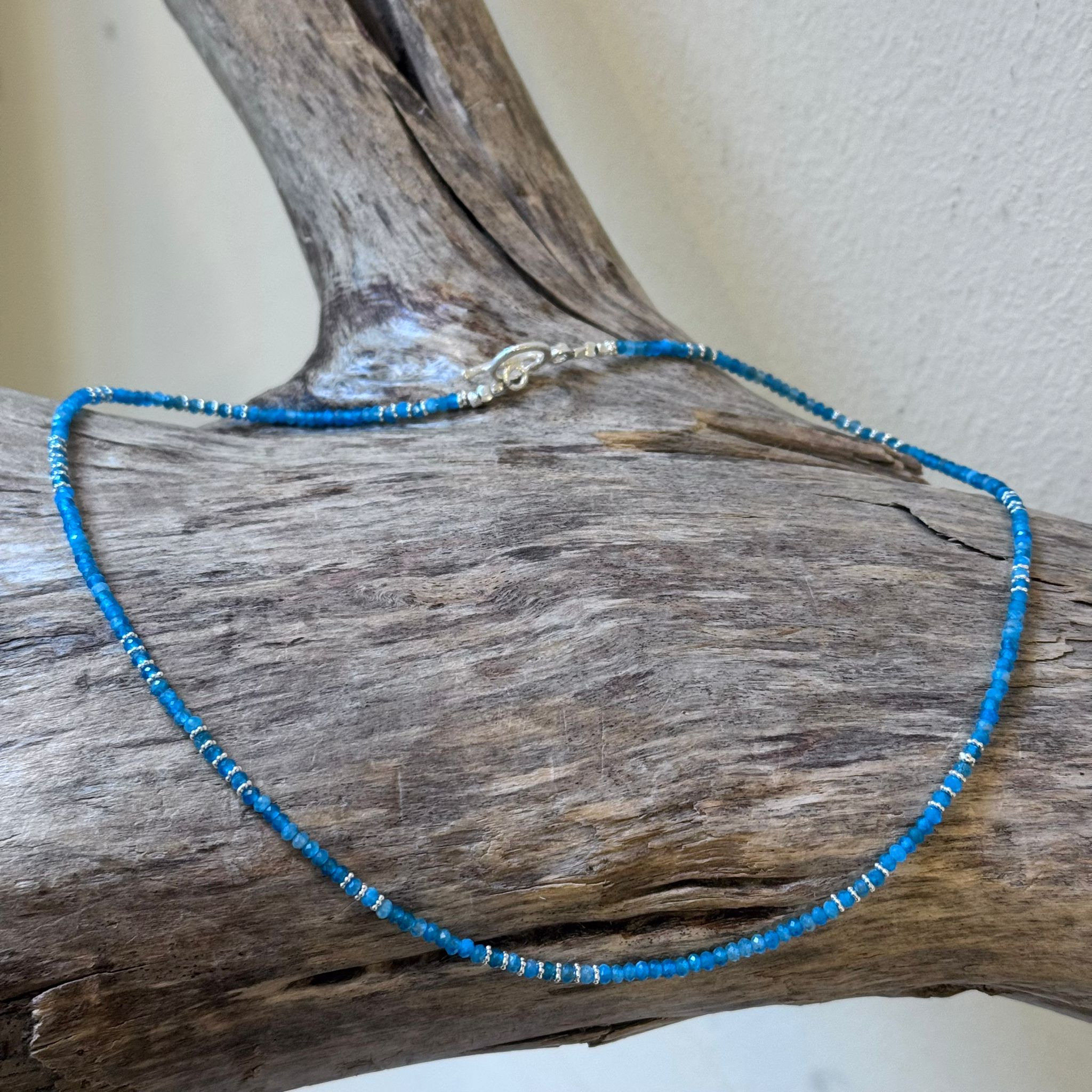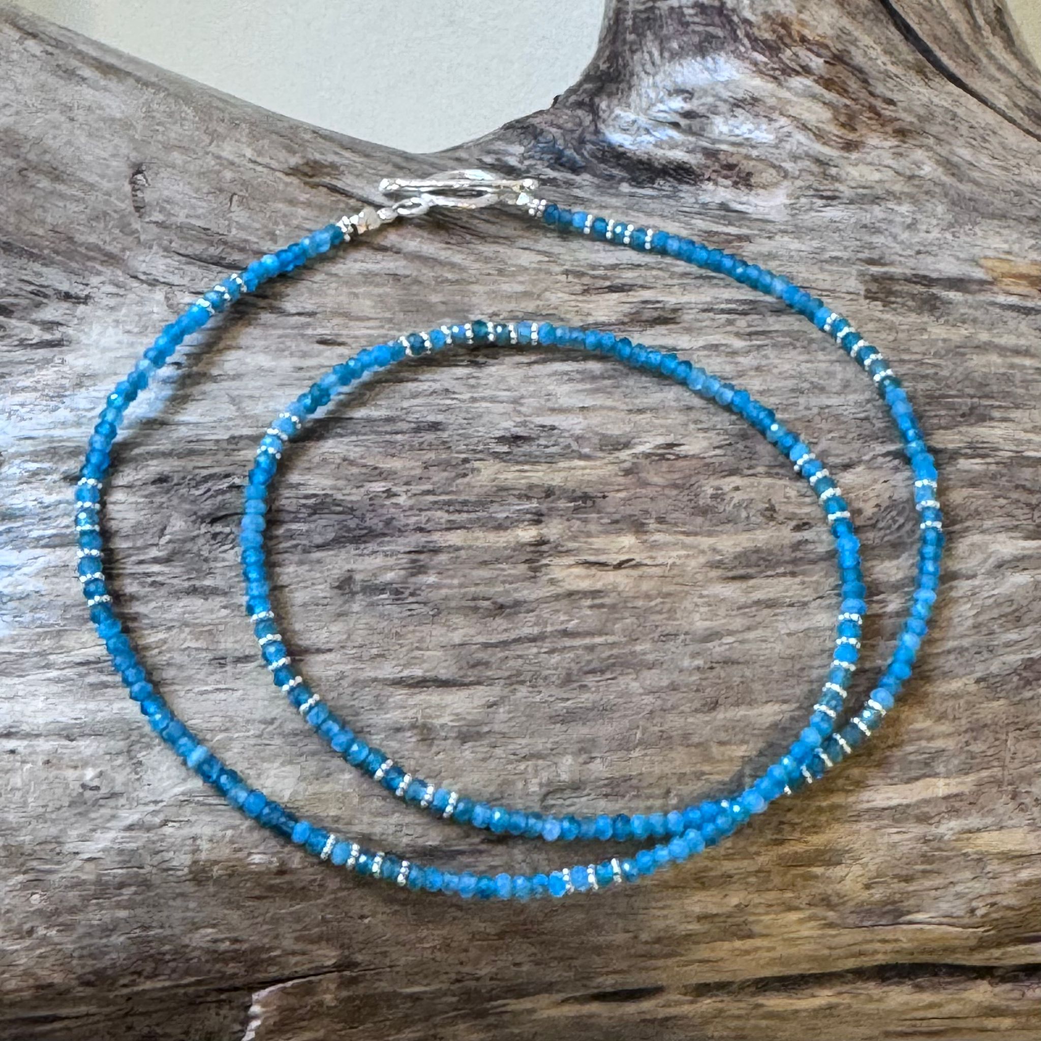 Diese schöne Kette haben wir aus facettiertem Apatit (2x3mm), vielen Zwischenstücken aus Sterlingsilber und einem dekorativem Ring-Stab-Verschuss aus mattiertem Sterlingsilber kreiert. Die Kette hat eine Länge von 43cm.