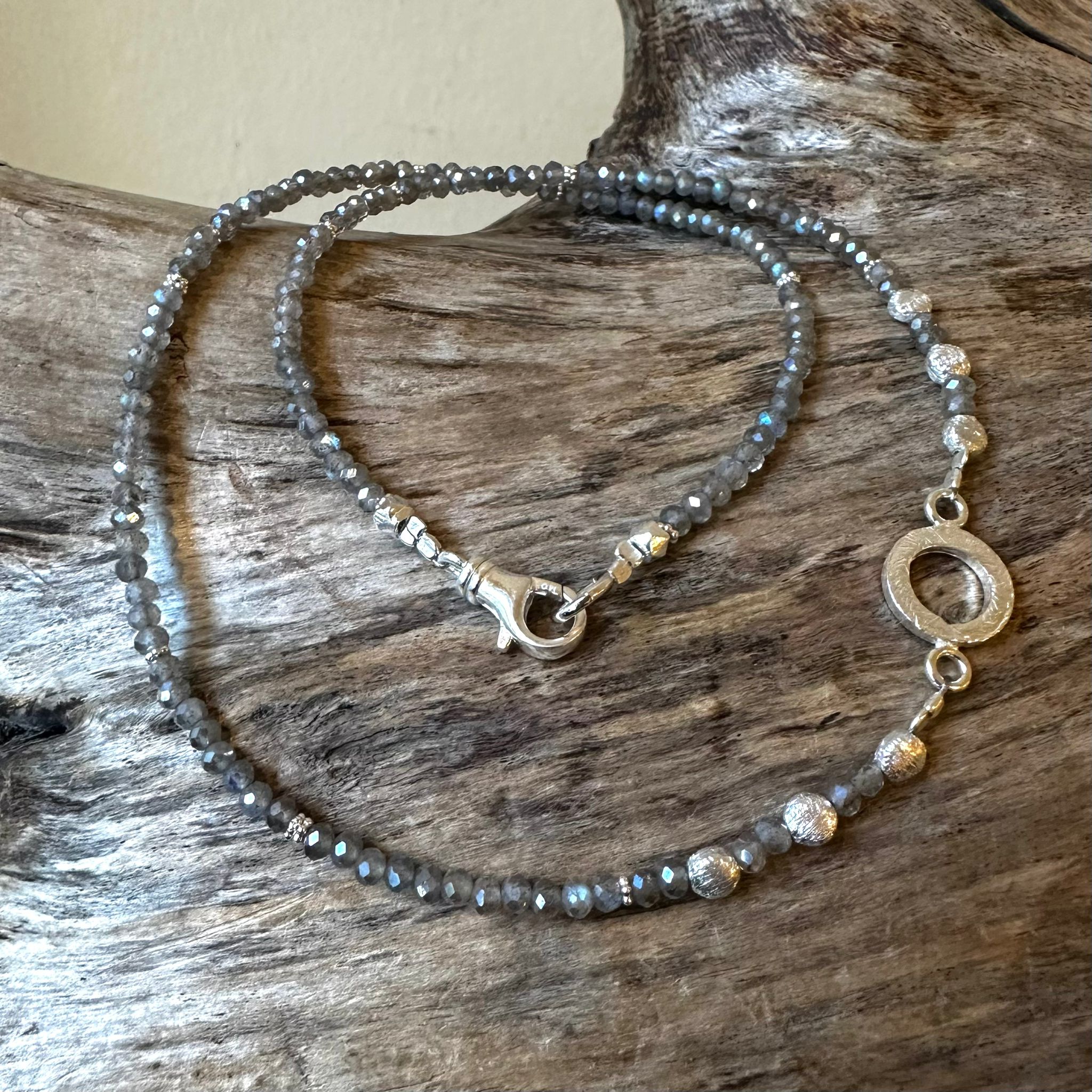 Diese schöne Kette haben wir aus facettiertem bedampftem Labradorit (2x3mm), Zwischenstücken aus Sterlingsilber, Elementen aus mattiertem Sterlingsilber (4mm) und einem Verbindungselement aus mattiertem Sterlingsilber (10mm) kreiert. Die Kette hat eine Länge von 42,5cm.