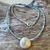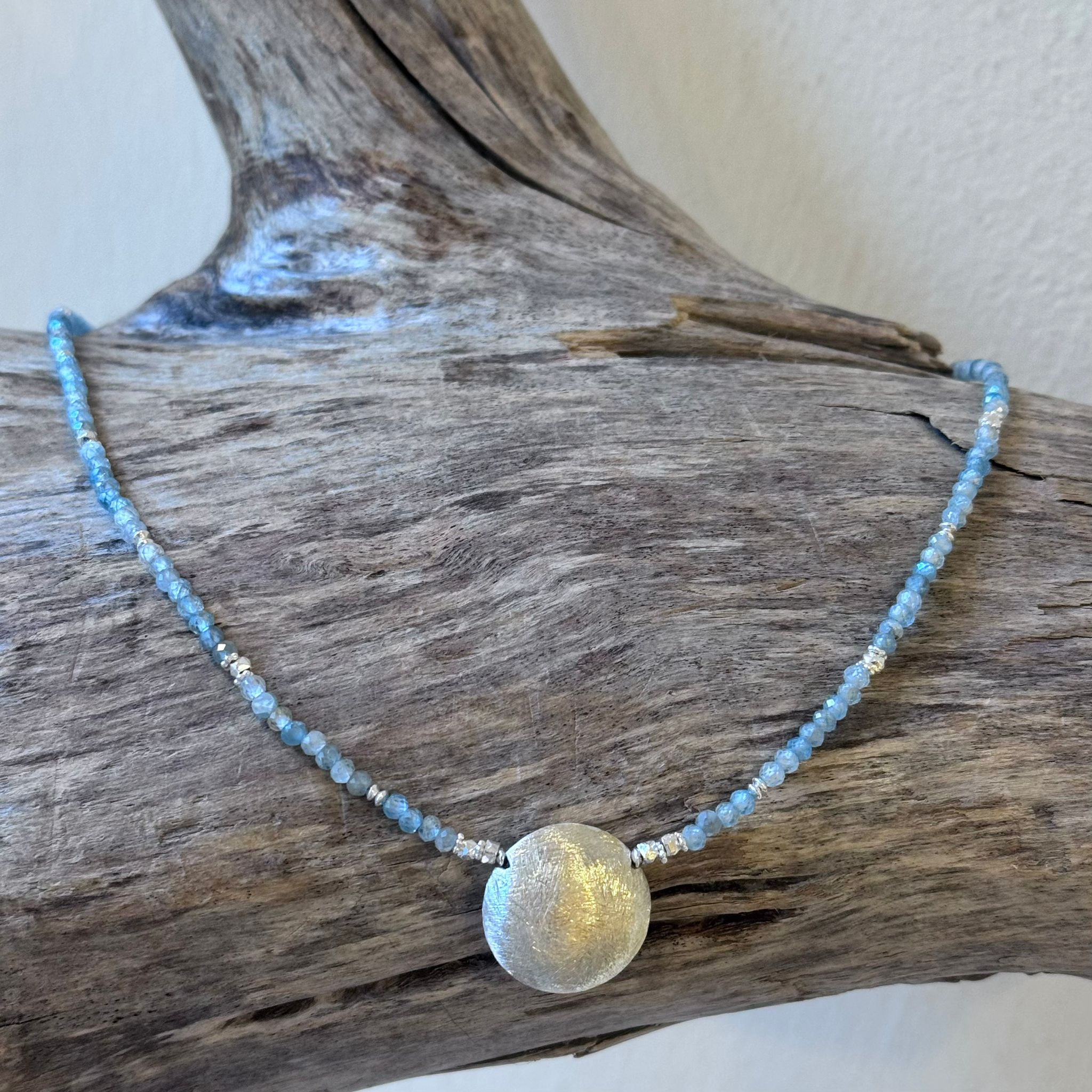 Diese schöne Kette haben wir aus facettiertem blauem Zirkon (2x3mm), vielen Zwischenstücken aus Sterlingsilber und einem Element aus mattiertem Sterlingsilber (18mm) kreiert. Die Kette hat eine Länge von 43cm.