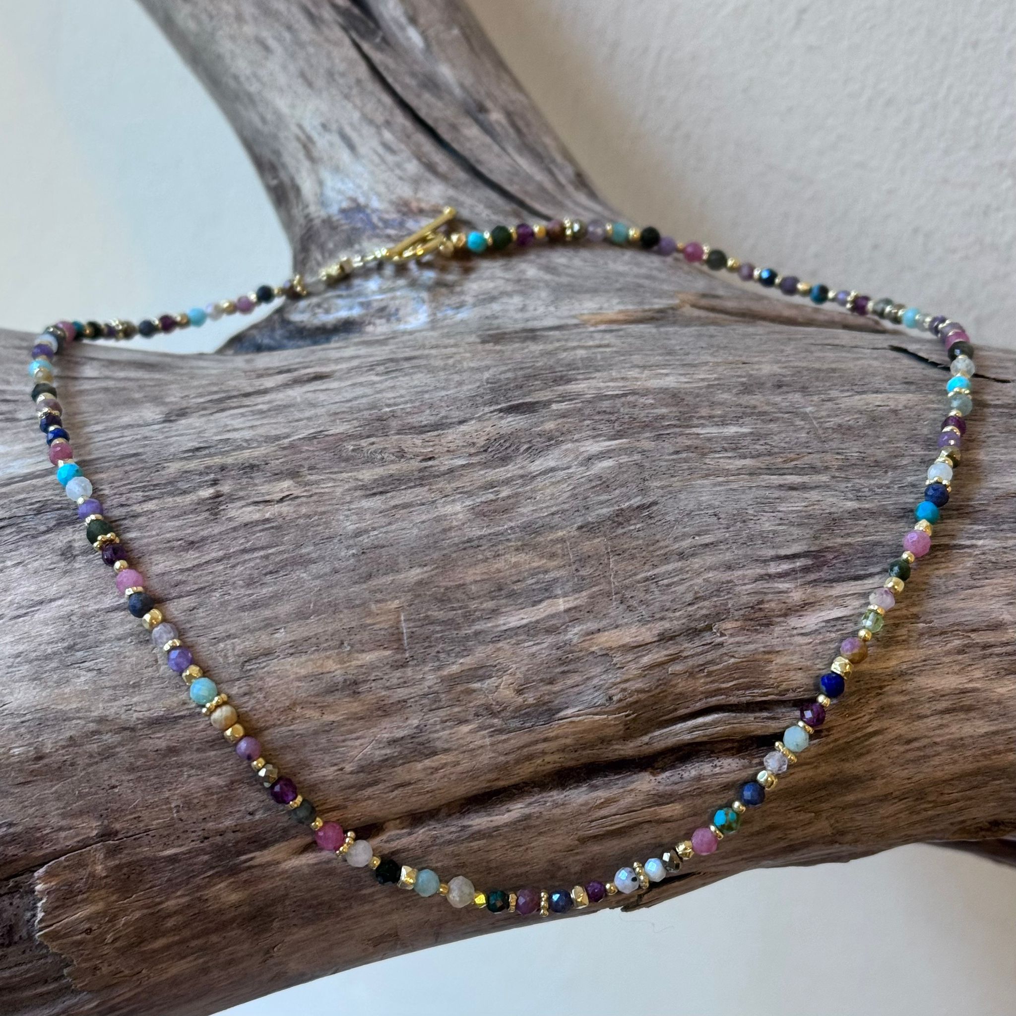 Diese schöne Kette haben wir aus verschiedensten facettierten Edelsteinen (2-3mm), sehr vielen Zwischenstücken aus vergoldetem Sterlingsilber und einem dekorativen Ring-Stab-Verschluss aus vergoldetem Sterlingsilber kreiert. Die Kette hat eine Länge von 42,5cm.