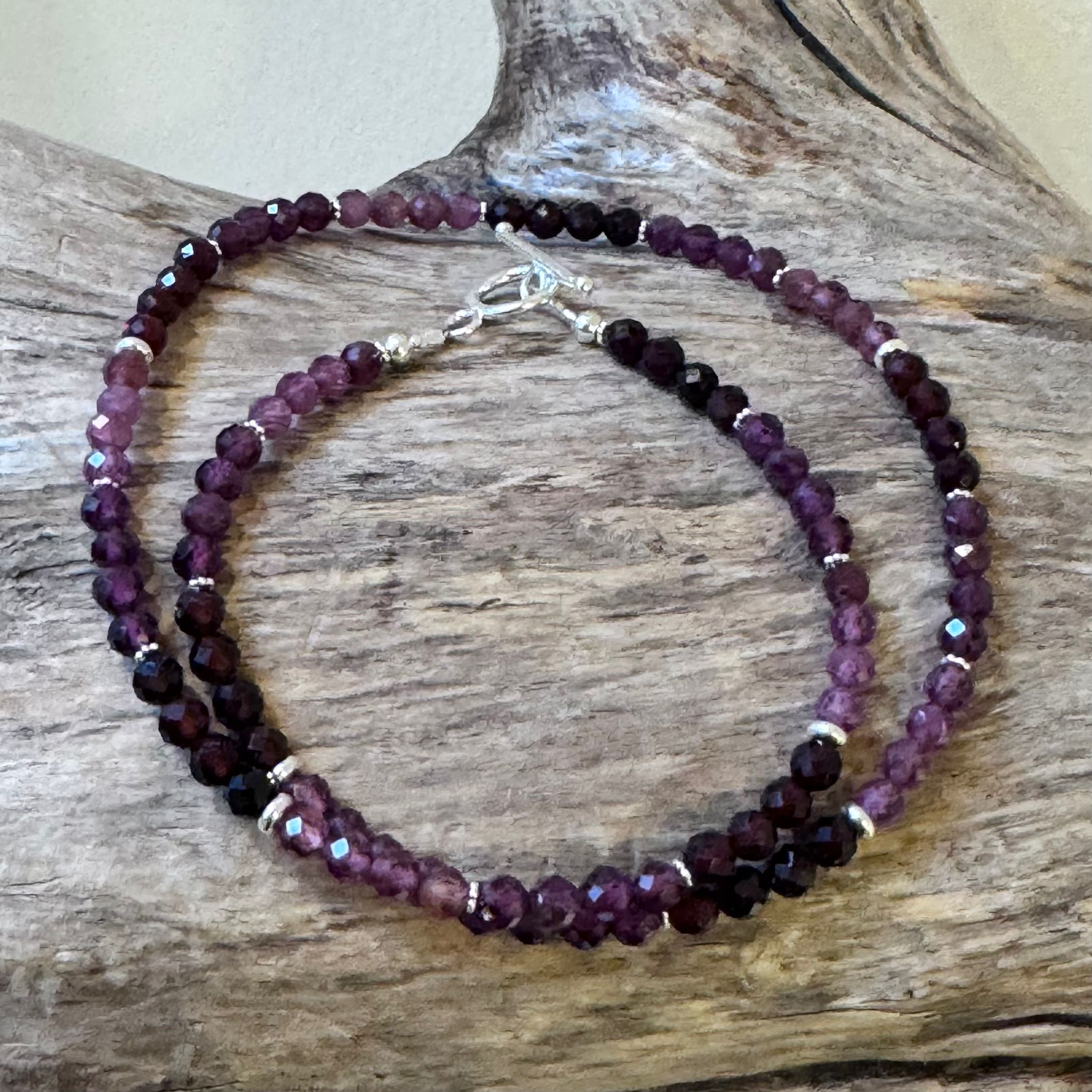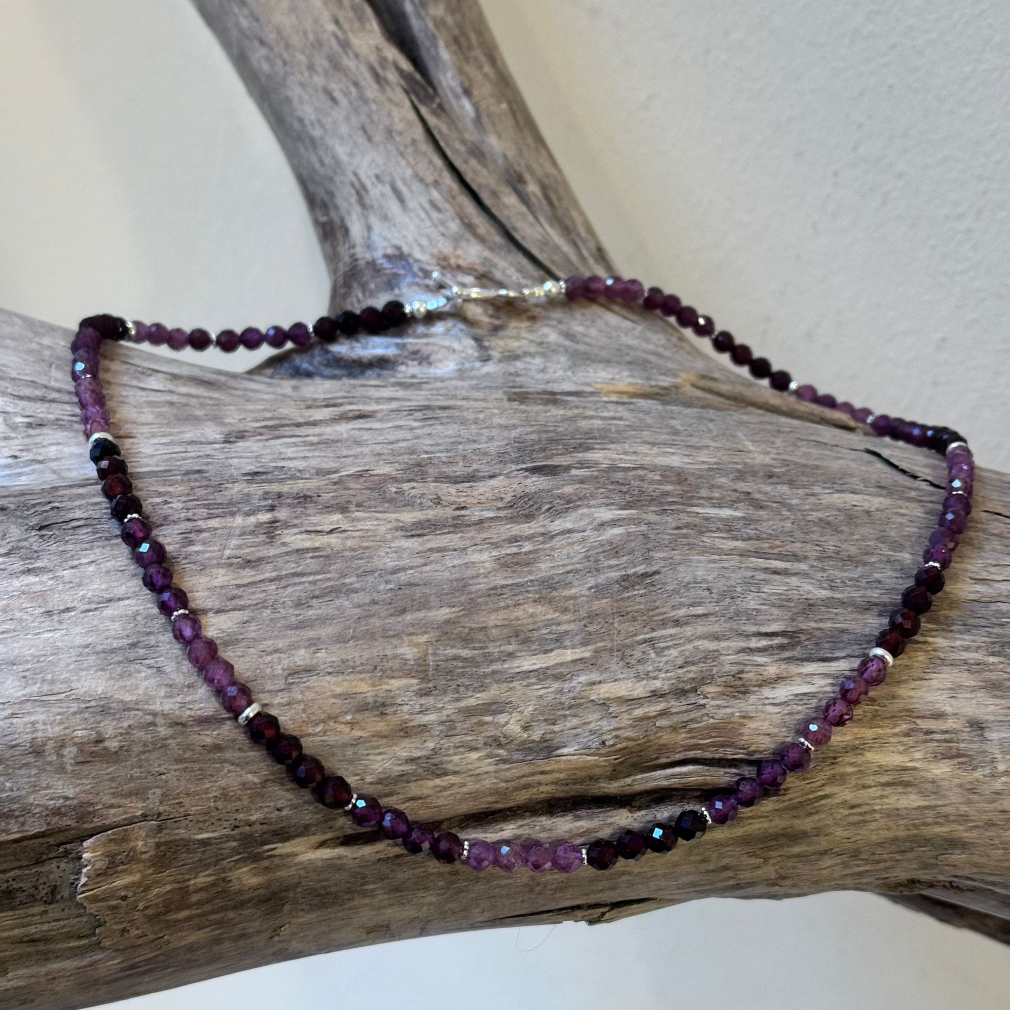Diese schöne Kette haben wir aus facettiertem Granat in drei verschiedenen Farbschattierungen (4mm), Zwischenstücken aus Sterlingsilber und einem dekorativem Ring-Stab-Verschluss aus Sterlingsilber kreiert. Die Kette hat eine Länge von 44,5cm.