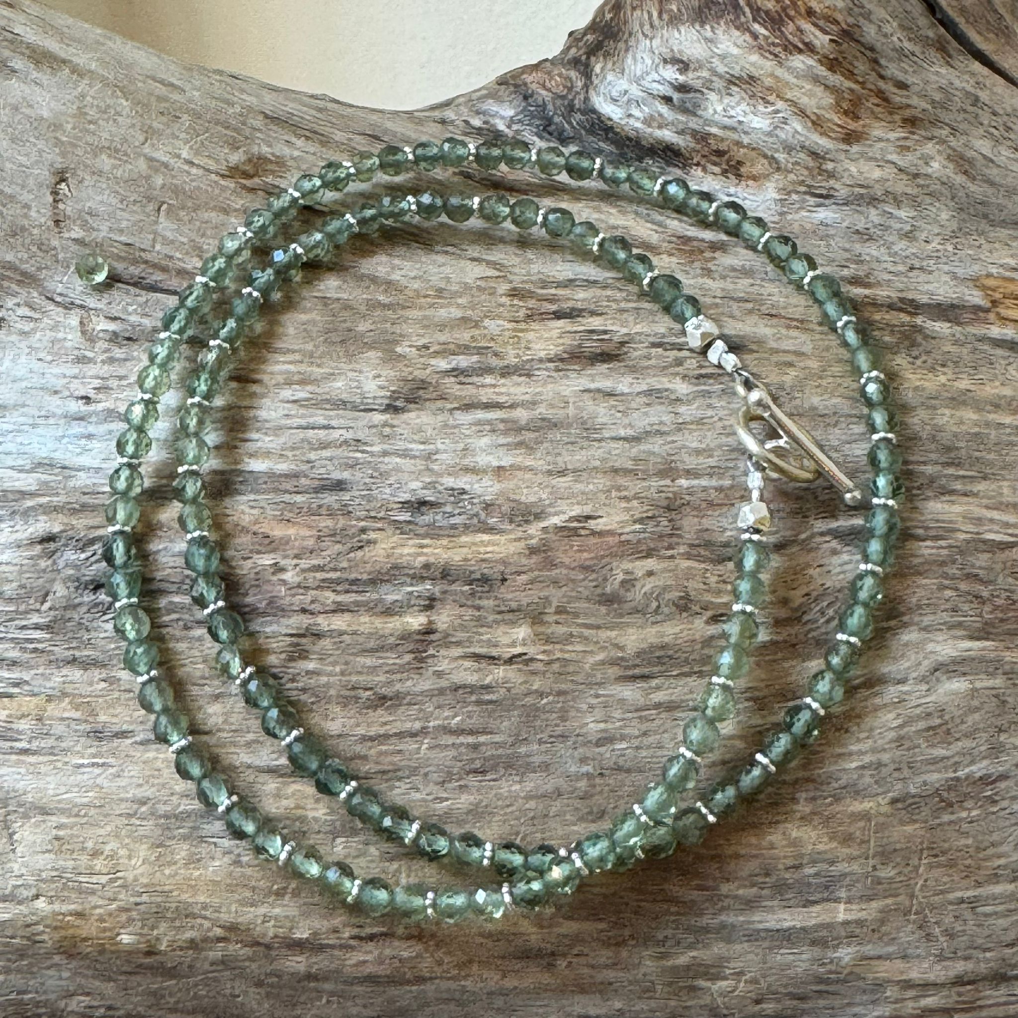 Diese schöne Kette haben wir aus facettierte grünem Apatit (3mm), sehr vielen Zwischenstücken aus Sterlingsilber und einem dekorativen Ring-Stab-Verschluss aus Sterlingsilber kreiert. Die Kette hat eine Länge von 43,7cm.