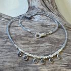 Diese schöne Kette haben wir aus facettiertem Labradorit (2mm), Zwischenstücken aus Sterlingsilber und Charms aus poliertem Labradorit (5mm) kreiert. Die Kette hat eine Länge von 41cm.