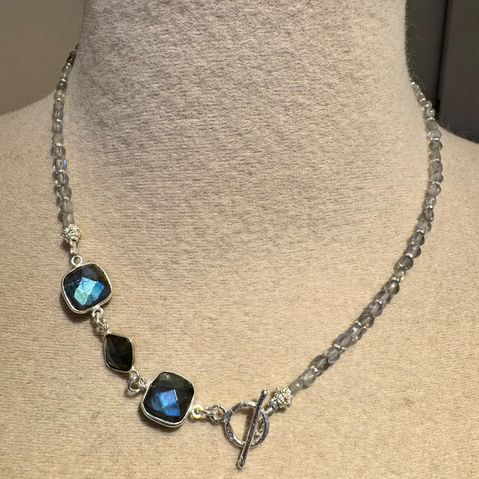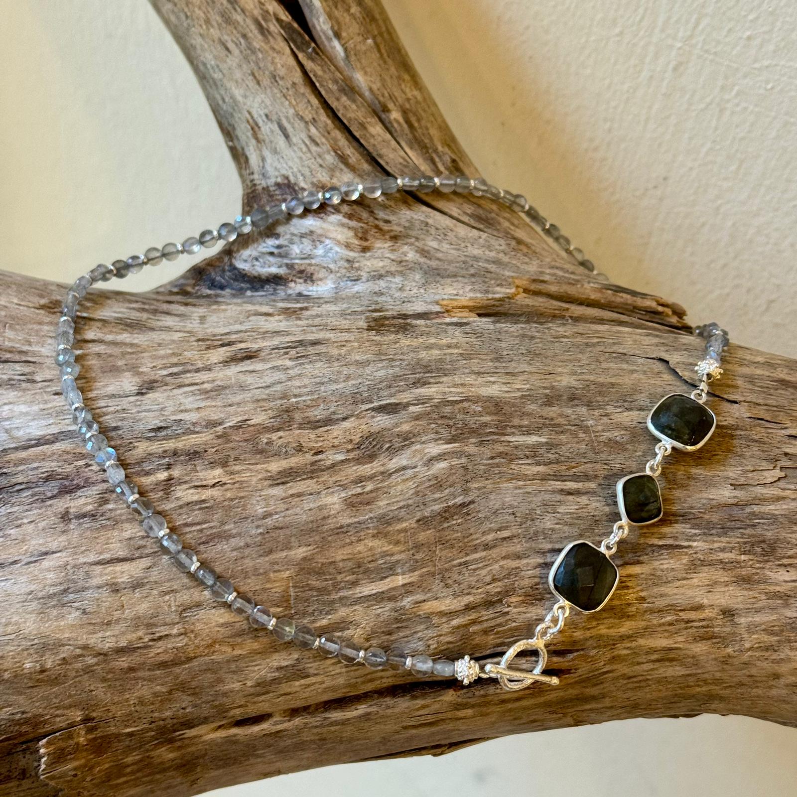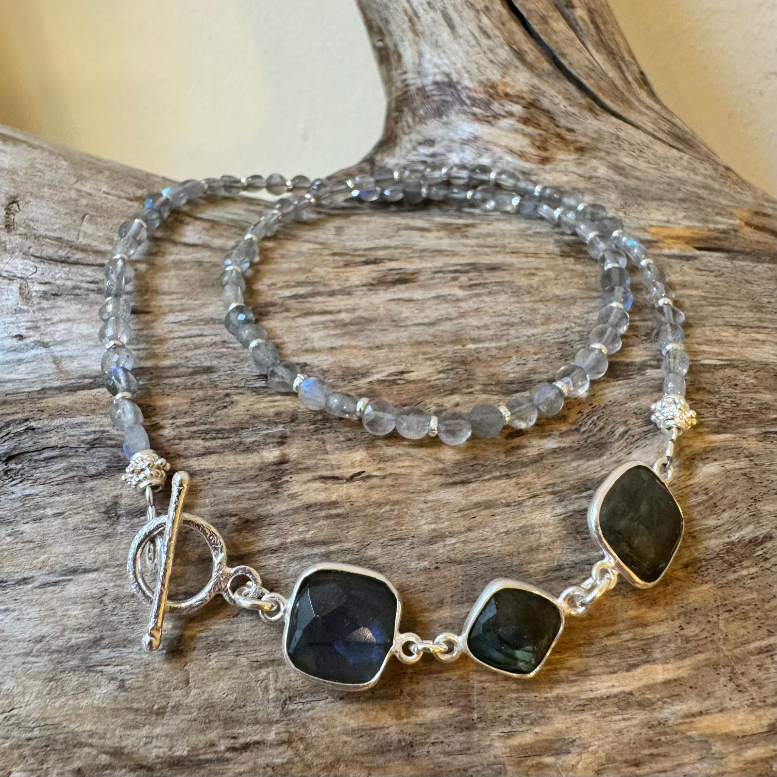 Diese schöne Kette haben wir aus facettiertem Labradorit in Münzform (3,5mm), sehr vielen Zwischenstücken aus Sterlingsilber, drei Verbindungselementen aus facettiertem Labradorit (10mm und 8mm) und einem dekorativen Ring-Stab-Verschluss aus mattiertem Sterlingsilber kreiert. Die Kette hat eine Länge von 42,4cm.