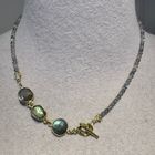 Diese schöne Kette haben wir aus facettiertem Labradorit in sehr schöner Qualität (3mm), vielen Zwischenstücken aus vergoldetem Sterlingsilber, Verbindungselementen aus facettiertem Labradorit (11mm und 11x9mm) und einem dekorativen Ring-Stab-Verschluss aus vergoldetem Sterlingsilber kreiert. Die Kette hat eine Länge von 42,5cm.