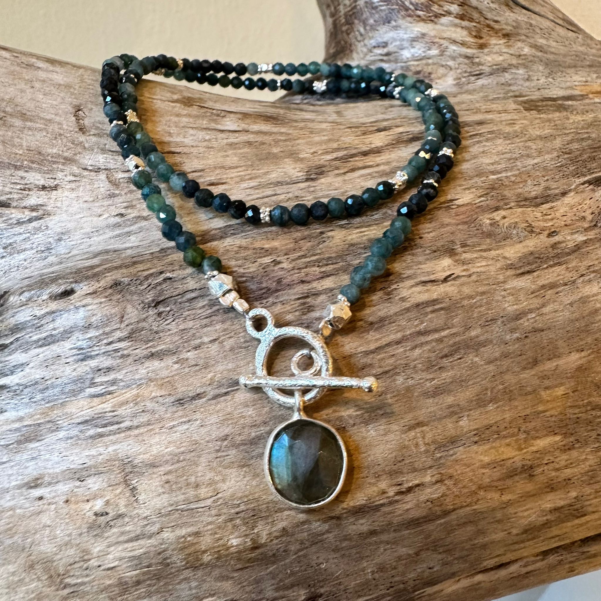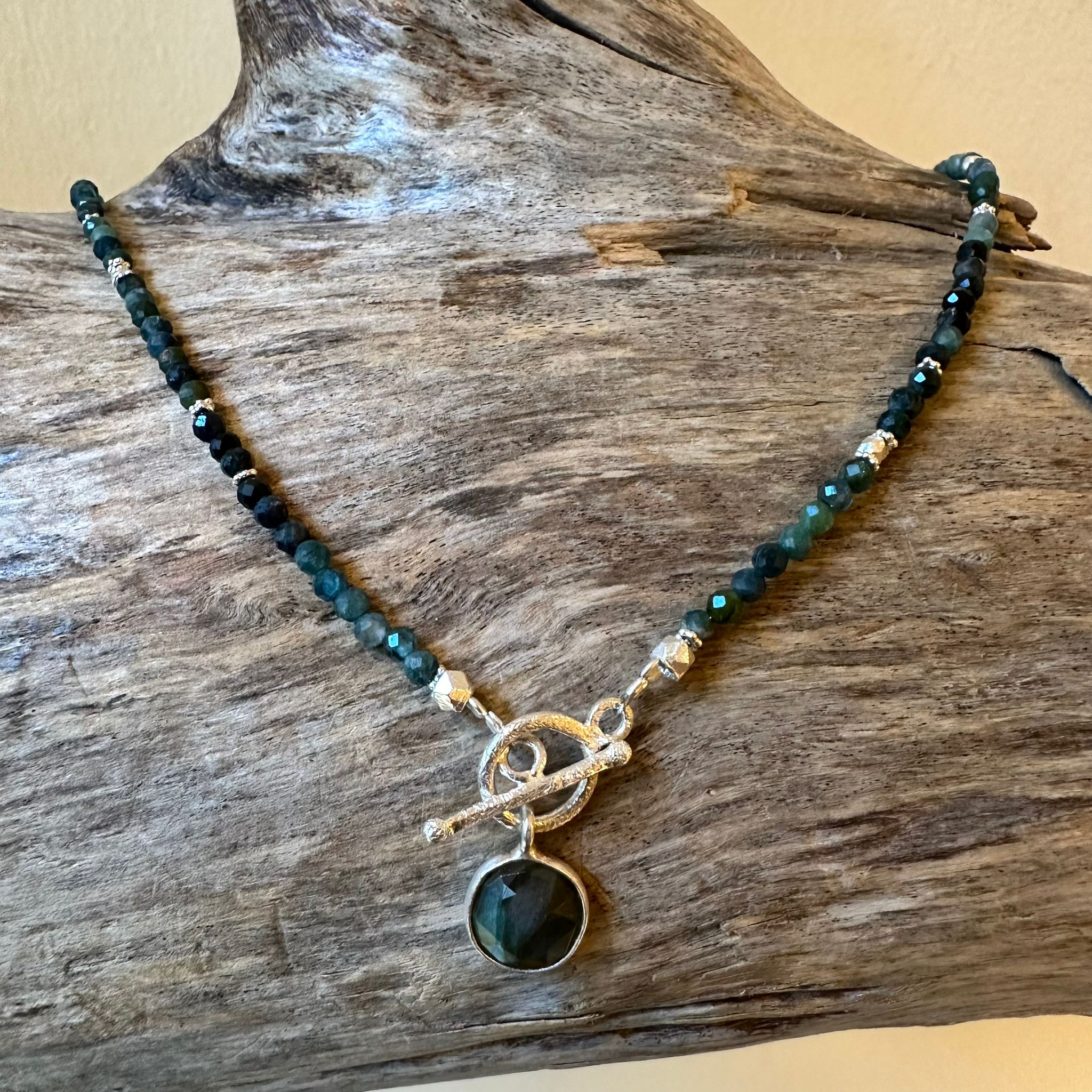 Diese schöne Kette haben wir aus facettiertem Paraiba Turmalin (3mm), Zwischenstücken aus Sterlingsilber, einem dekorativem Ring-Stab-Verschluss aus mattiertem Sterlingsilber und einem Anhänger aus facettiertem Labradorit (10mm) kreiert. Die Kette hat eine Länge von 42,5cm.