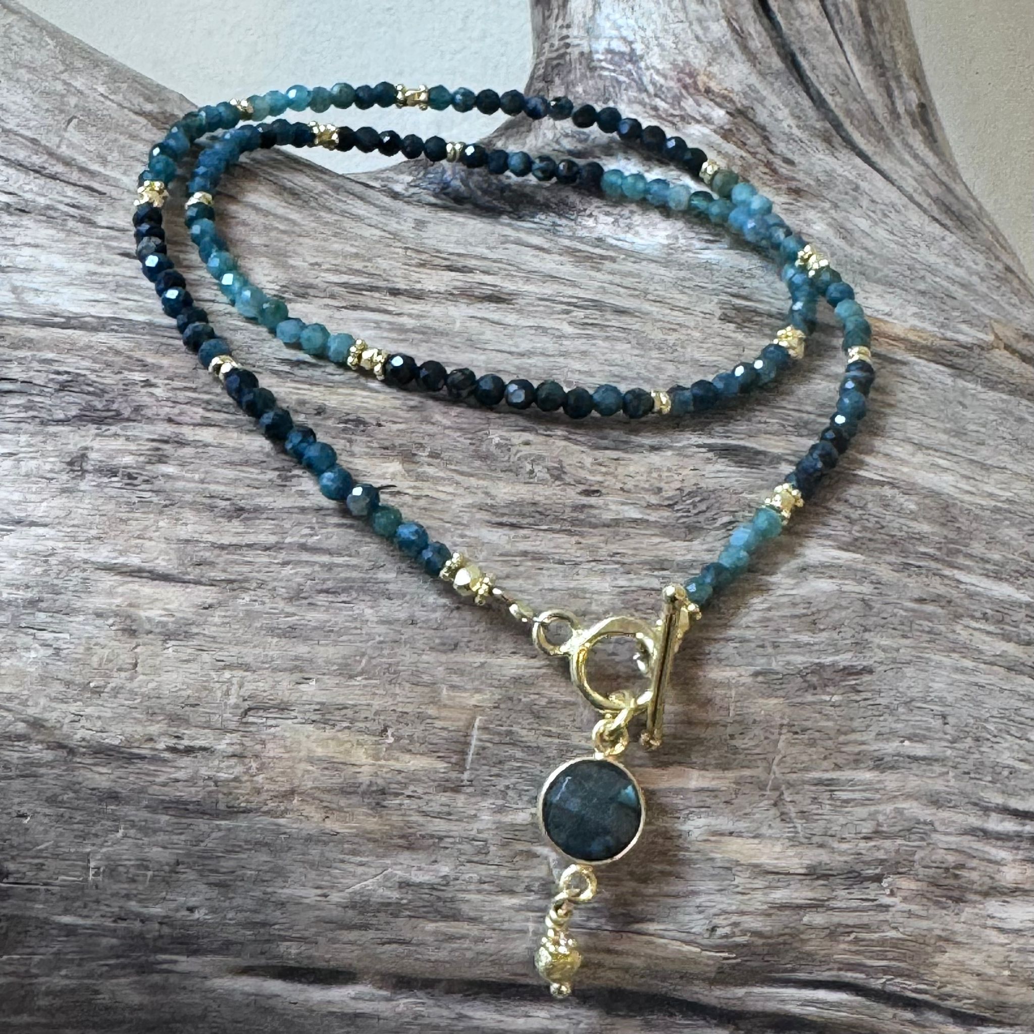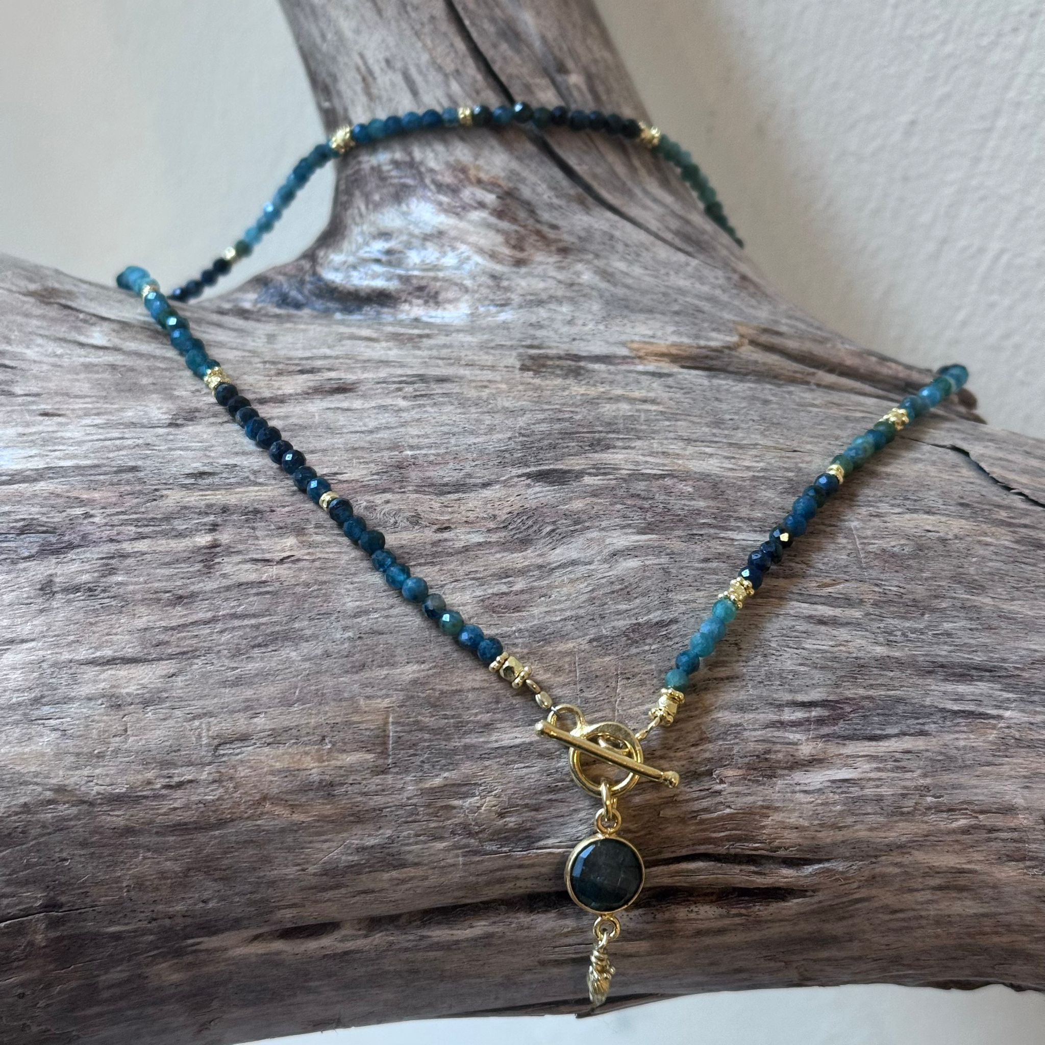 Diese schöne Kette haben wir aus facettiertem Paraiba Turmalin (3mm), Zwischenstücken aus vergoldetem Sterlingsilber, einem dekorativem Ring-Stab-Verschluss aus vergoldetem Sterlingsilber und einem Anhänger aus facettiertem Labradorit (9mm) mit einem Element aus mattiertem vergoldetem Sterlingsilber (4mm) kreiert. Die Kette hat eine Länge von 43cm.