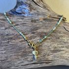 Diese schöne Kette haben wir aus facettiertem Peridot (2mm), facettiertem Amazonit (3mm), Zwischenstücken aus vergoldetem Sterlingsilber, einem dekorativem S-Verschluss aus vergoldetem Sterlingsilber und einem Charm aus einem Element aus vergoldetem Sterlingsilber (8x10mm) und einem facettiertem Amazonit (3mm) kreiert. Die Kette hat eine Länge von 42,5cm.