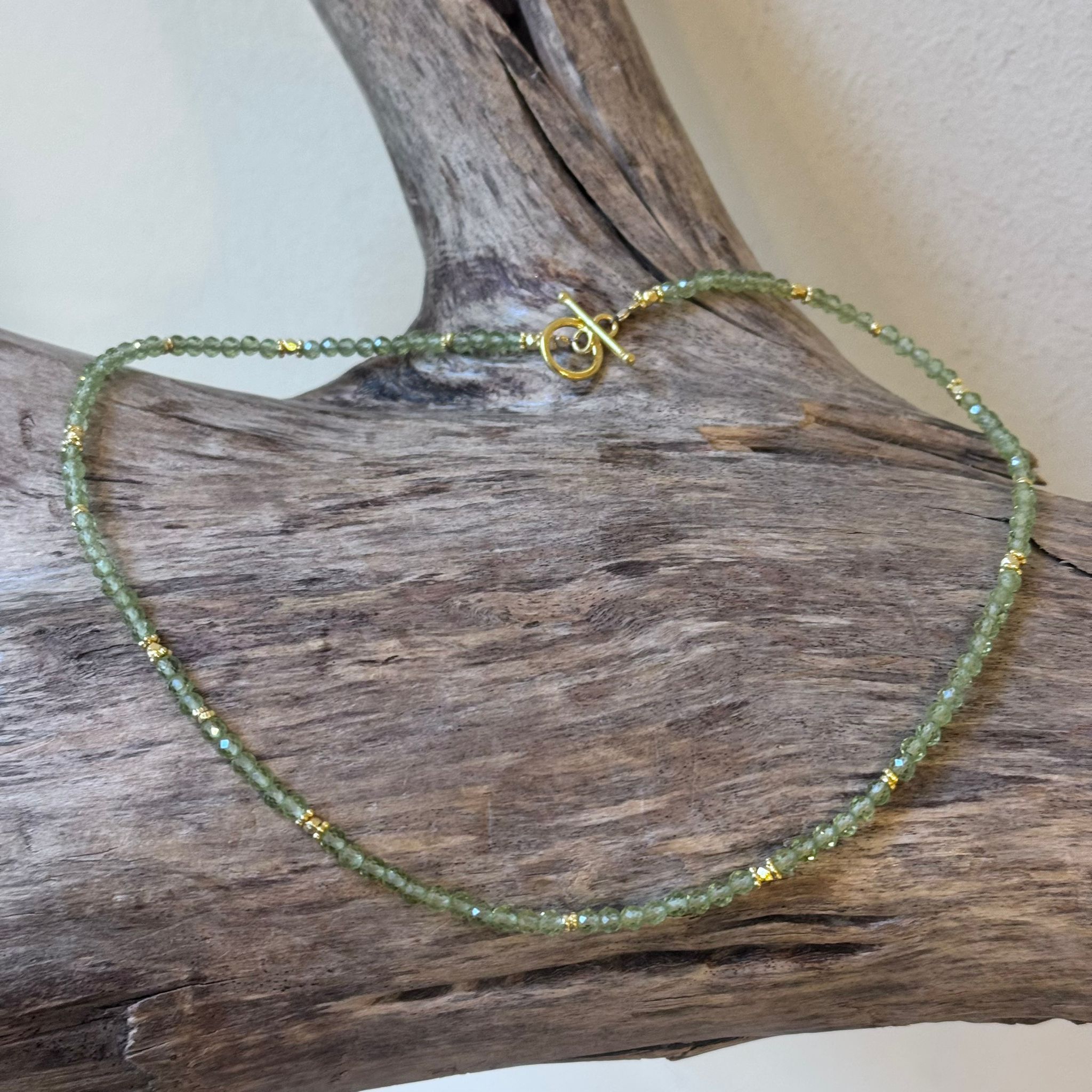 Diese schöne Kette haben wir aus facettiertem Peridot in sehr schöner Qualität (3mm), Zwischenstücken aus vergoldetem Sterlingsilber und einem dekorativen Ring-Stab-Verschluss aus vergoldetem Sterlingsilber kreiert. Die Kette hat eine Länge von 42cm.