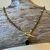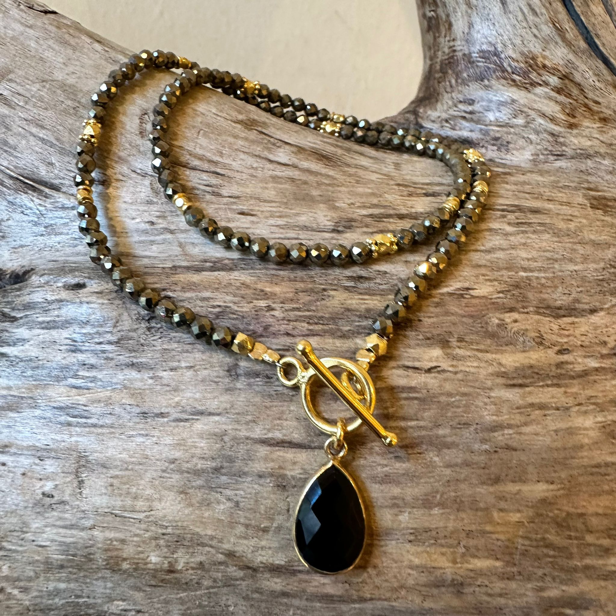 Diese schöne Kette haben wir aus facettiertem Pyrit (3mm), Zwischenstücken aus vergoldetem Sterlingsilber, einem dekorativen Ring-Stab-Verschluss aus vergoldetem Sterlingsilber und einem Anhänger aus facettiertem Onyx in Tropfenform (12x8mm) kreiert. Die Kette hat eine Länge von 42,5cm.