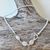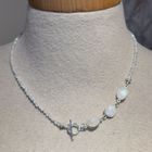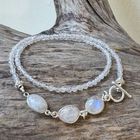 Diese schöne Kette haben wir aus facettiertem Regenbogen-Mondstein in sehr schöner Qualität (3mm), sehr vielen Zwischenstücken aus Sterlingsilber, drei Verbindungselementen aus facettiertem Regenbogen-Mondstein (ca. 14x10mm) und einem dekorativen Ring-Stab-Verschluss aus mattiertem Sterlingsilber kreiert. Die Kette hat eine Länge von 42,5cm.