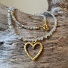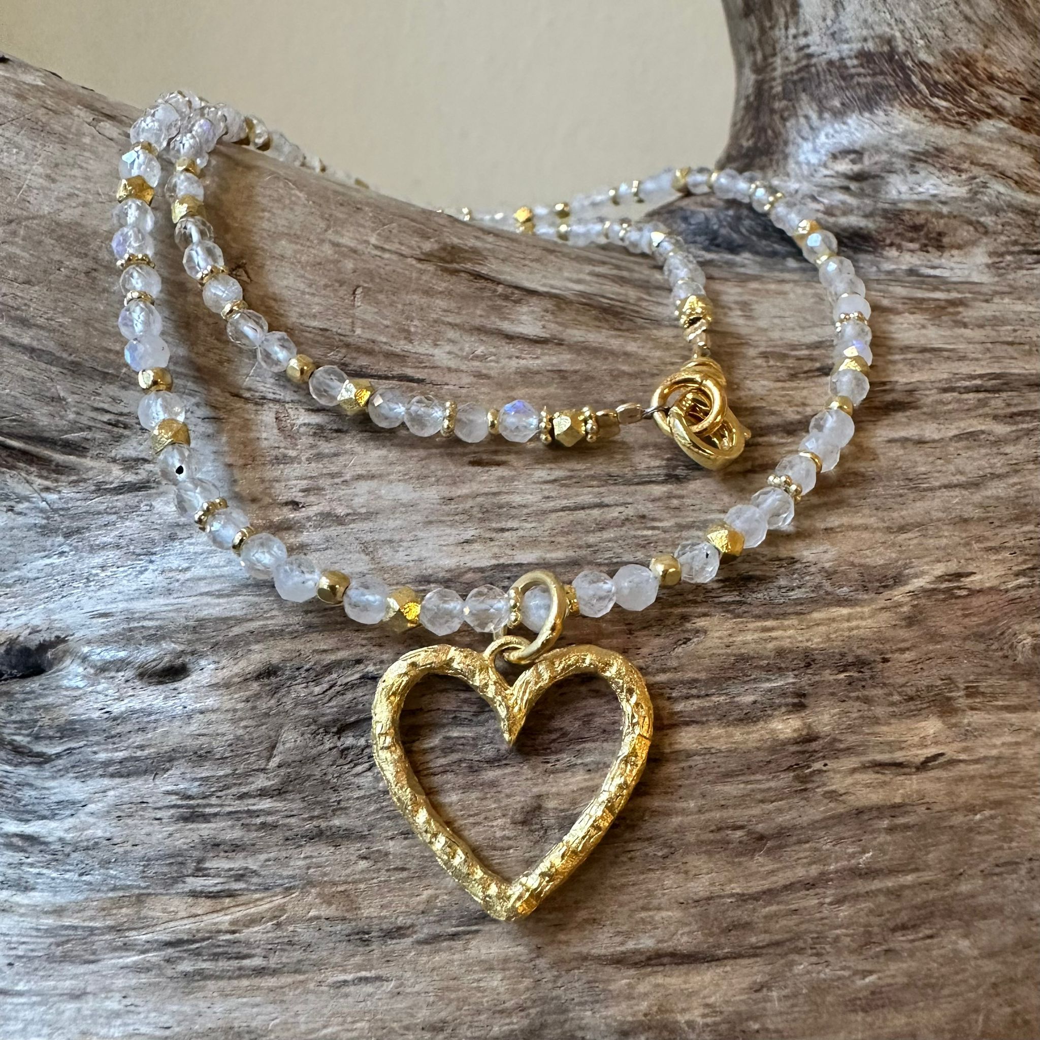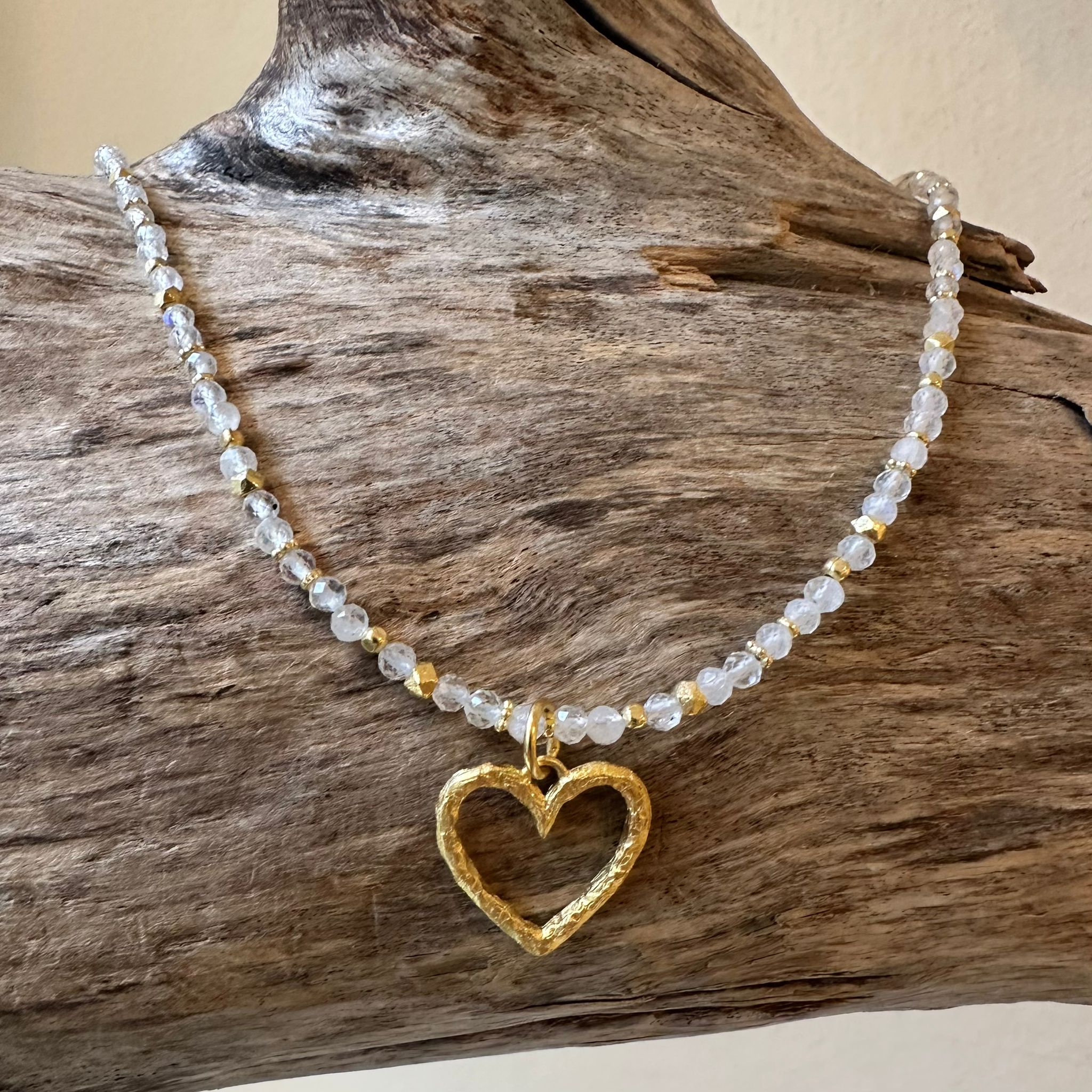 Diese schöne Kette haben wir aus facettiertem Regenbogen-Mondsstein (3mm), sehr vielen Zwischenstücken aus vergoldetem Sterlingsilber und einem Herz-Anhänger aus mattiertem vergoldetem Sterlingsilber (20x18mm) kreiert. Die Kette hat eine Länge von 43cm.