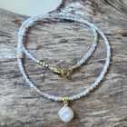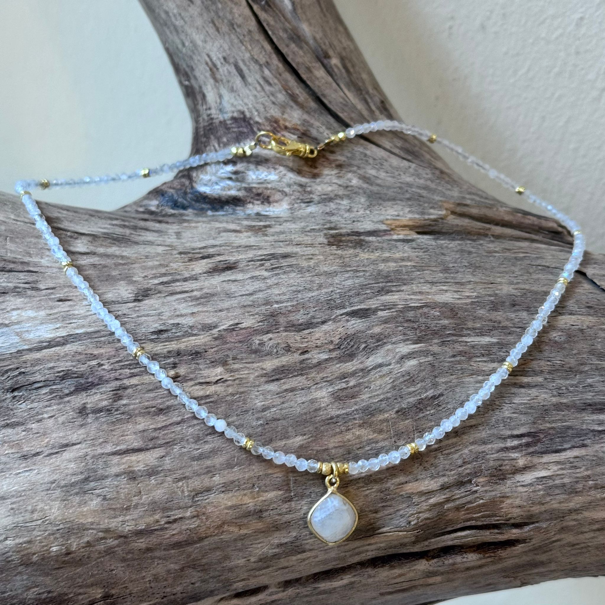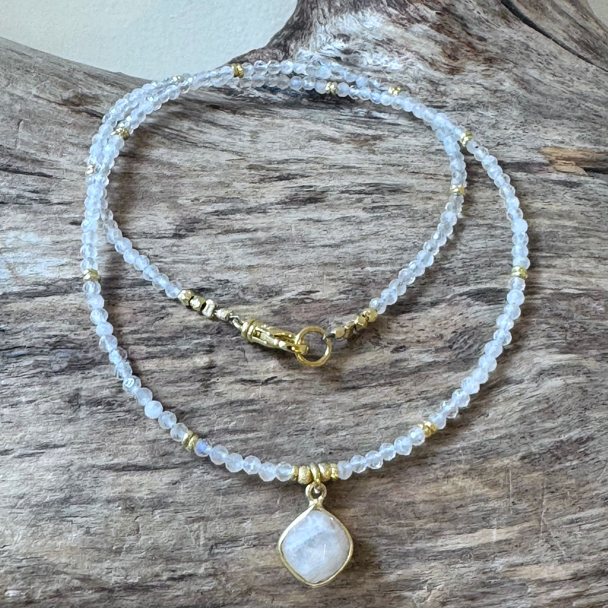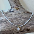 Diese schöne Kette haben wir aus facettiertem Regenbogen-Mondstein in sehr schöner Qualität (2mm), Zwischenstücken aus vergoldetem Sterlingsilber und einem Charm aus facettiertem Regenbogen-Mondstein (10mm) kreiert. Die Kette hat eine Länge von 40,5cm.