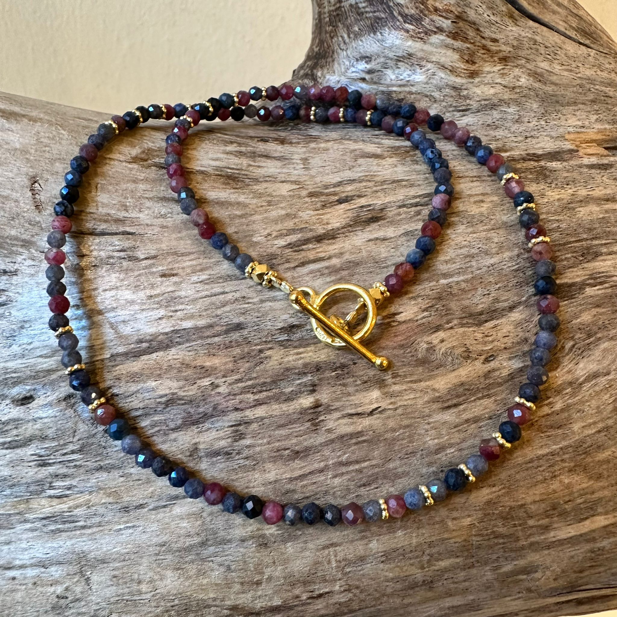 Kette facettierter Rubin, Saphir und vergoldetes Sterlingsilber