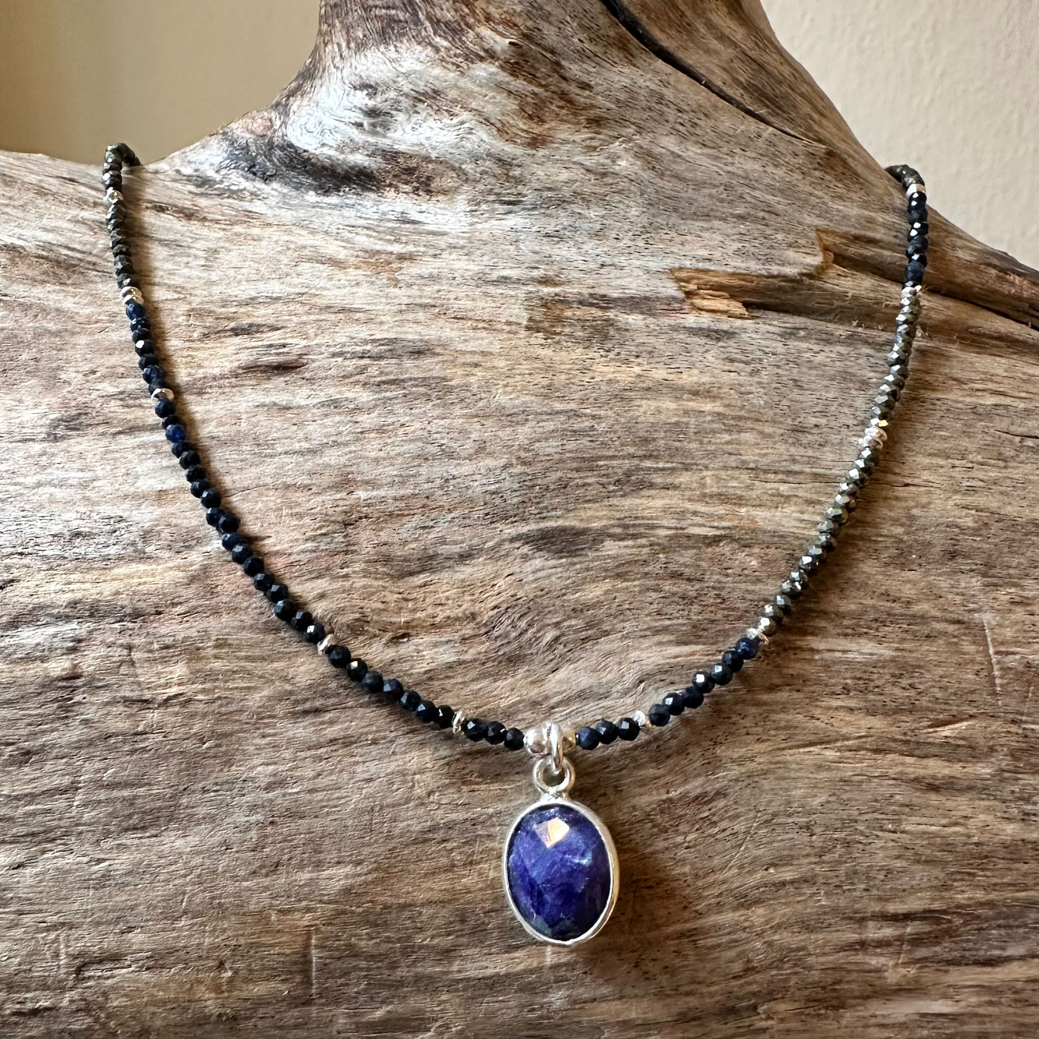 Kette facettierter Saphir, Hämatit und Sterlingsilber