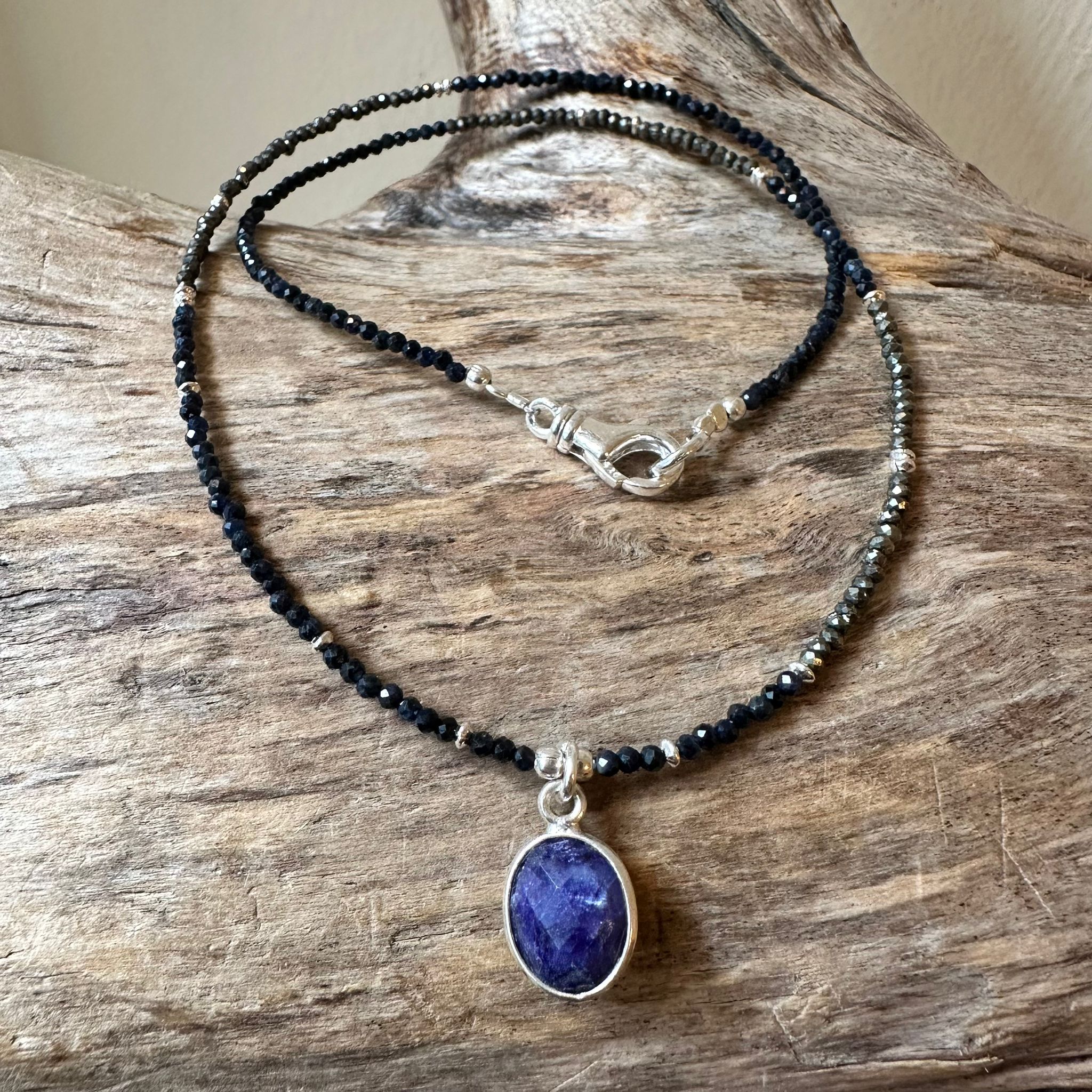Diese schöne Kette haben wir aus facettiertem Saphir (1,7mm), facettiertem Pyrit (2mm), Zwischenstücken aus Sterlingsilber und einem Anhänger aus facettiertem Saphir (10x8mm) kreiert. Die Kette hat eine Länge von 43cm.