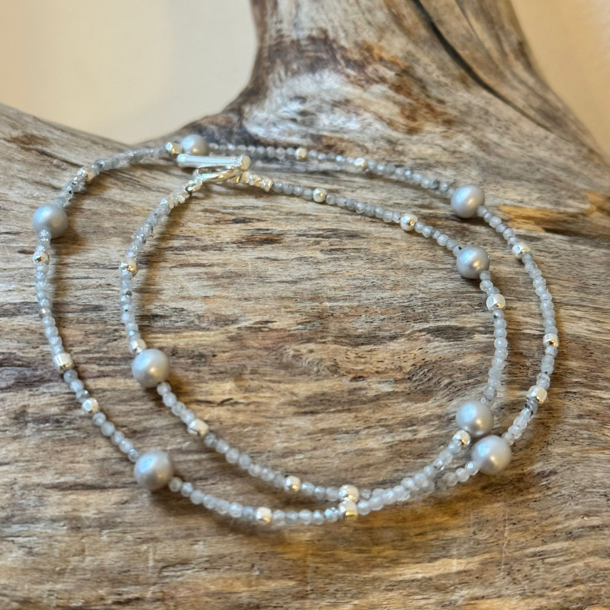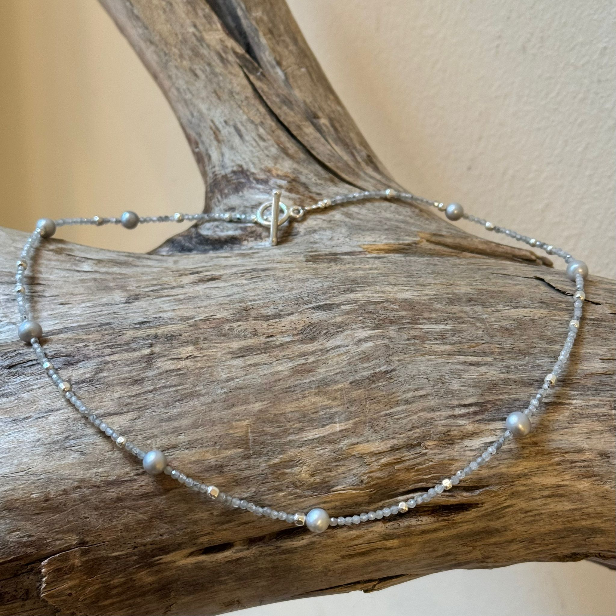 Diese schöne Kette haben wir aus facettiertem Silberzirkon (1,7mm), Zwischenstücken aus Sterlingsilber, hellgrauen Süsswasserperlen (5mm) und einem dekorativen Ring-Stab-Verschluss aus poliertem Sterlingsilber kreiert. Die Kette hat eine Länge von 43cm.